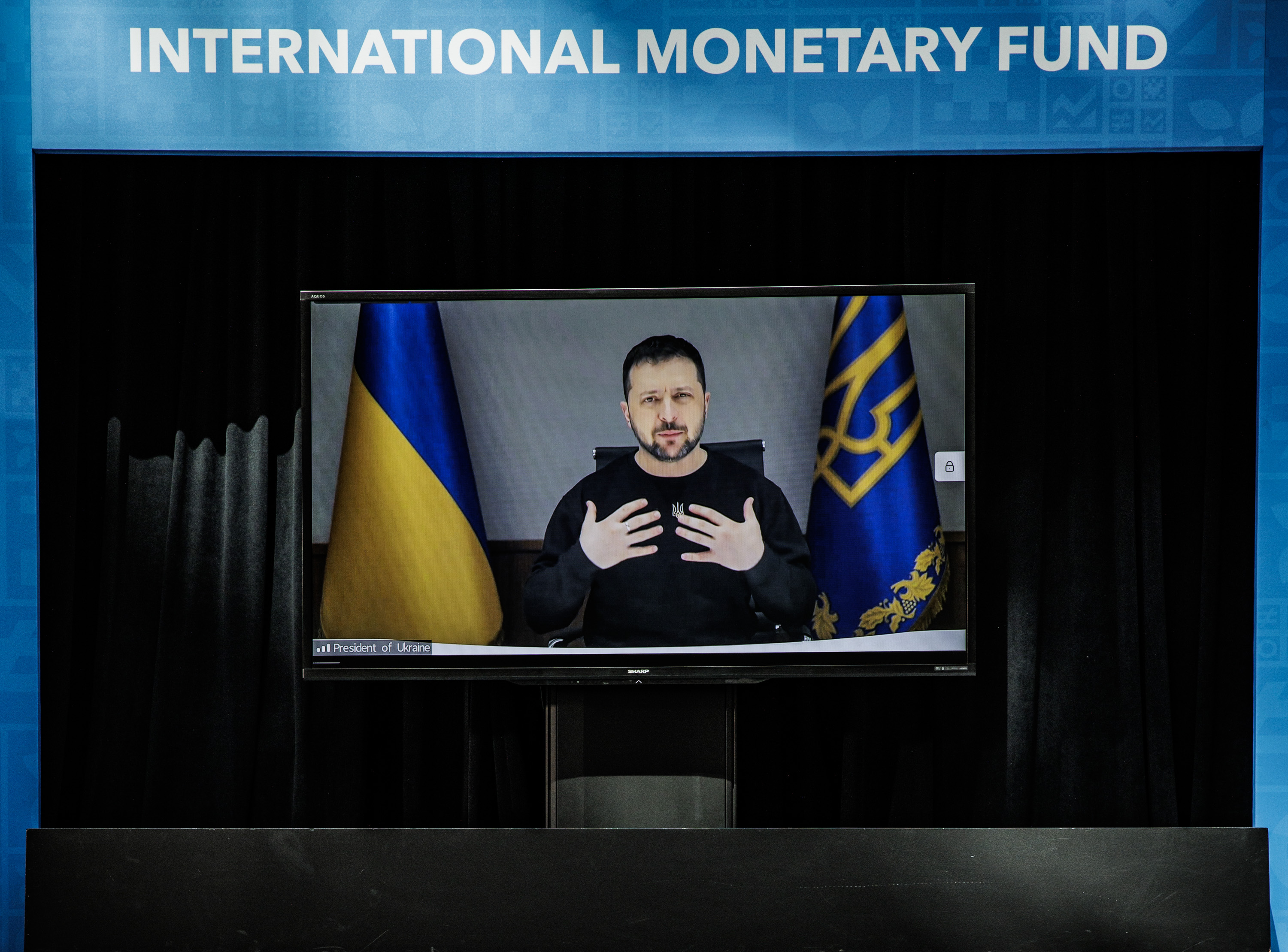 乌克兰总统弗拉基米尔·泽连斯基通过视频会议在华盛顿举行的国际货币基金组织和世界银行春季会议上发言,时间为4月12日。