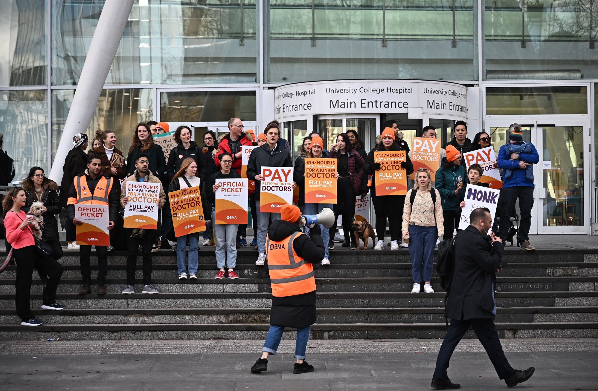 伦敦大学学院医院外,初级医生罢工时的纠察线,日期为4月12日。