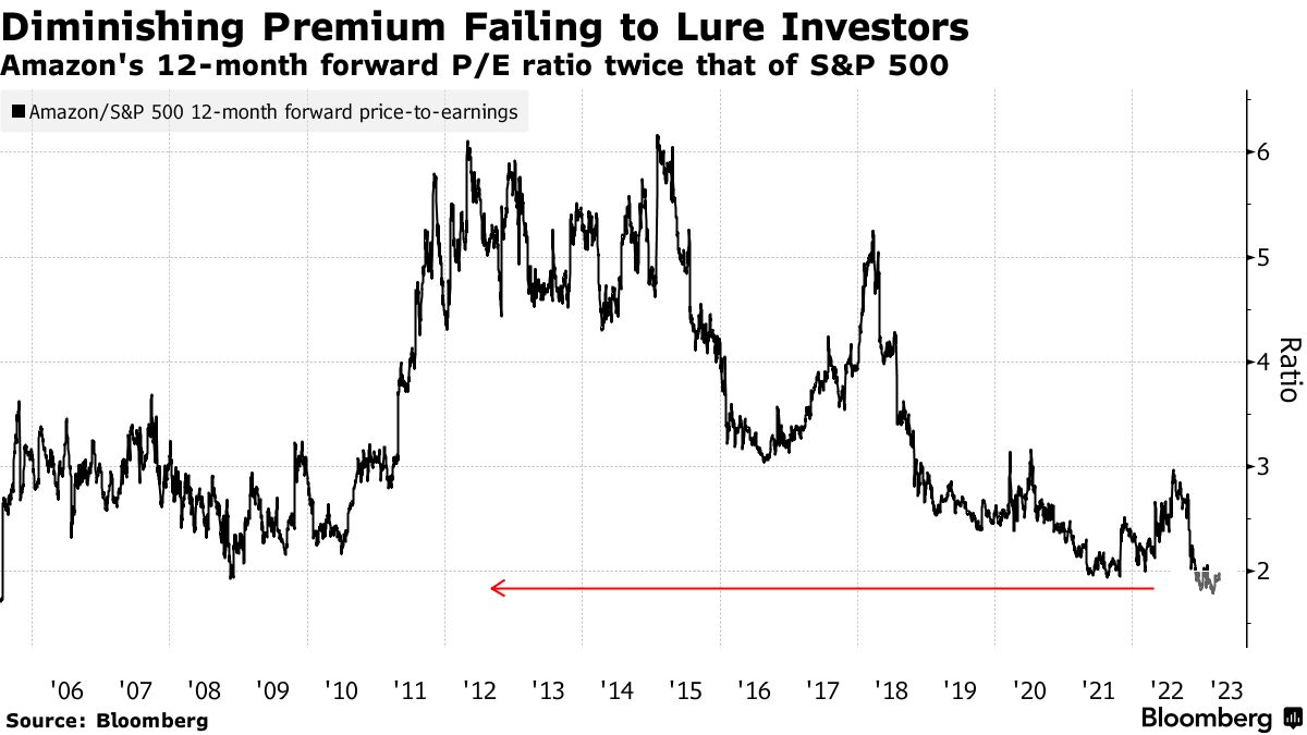 亚马逊公司今年股价上涨了19%,但对于整体市场来说,其股价相对于创纪录低位的市场没有太大提振作用。随着增长放缓,与过去一年的大科技集团一样,估值显著下降,其相对于标普500指数的溢价正在减少,未能吸引投资者回归。