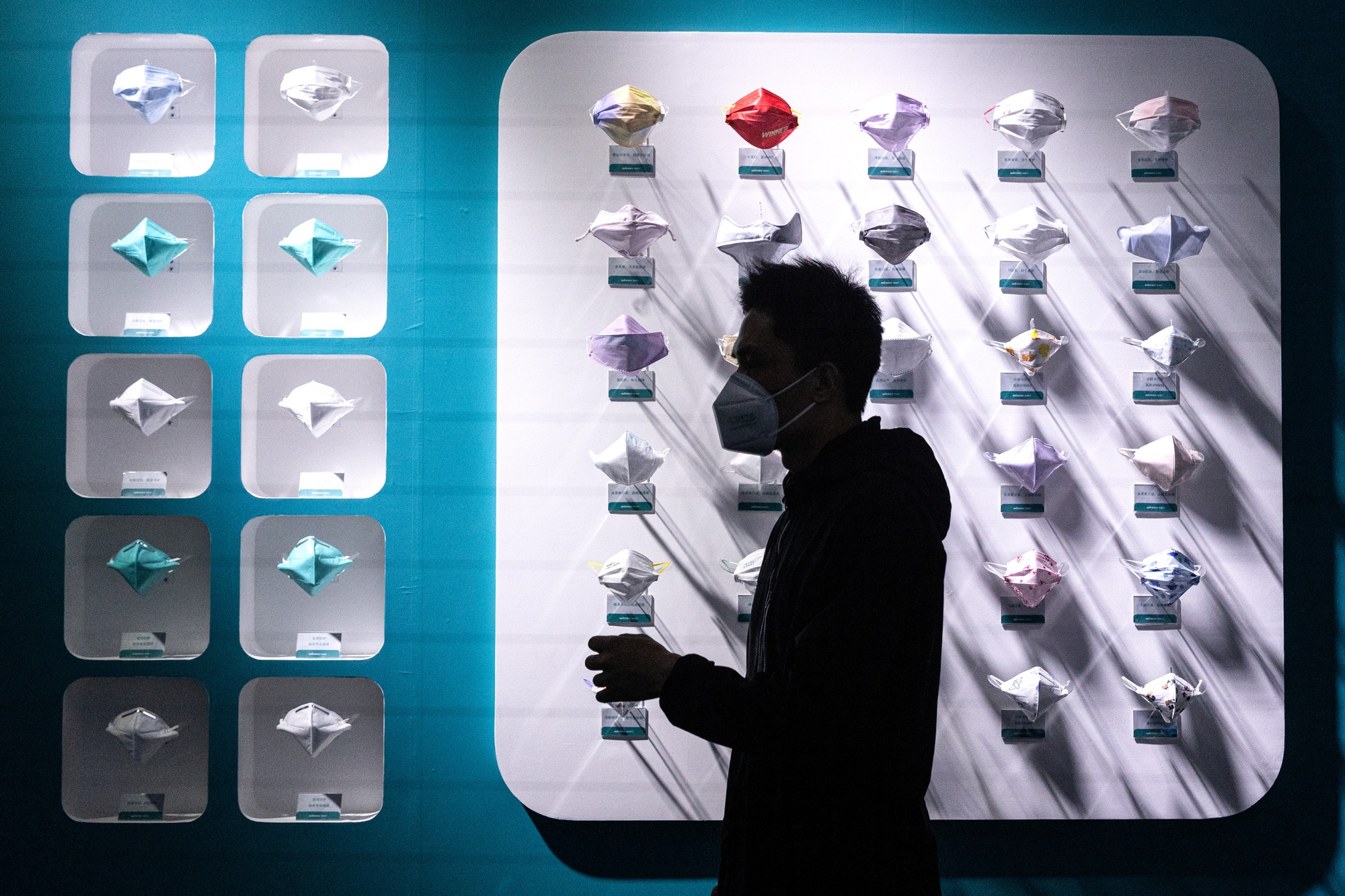 2023年4月7日,在武汉举行的世界卫生博览会上的口罩展示墙。