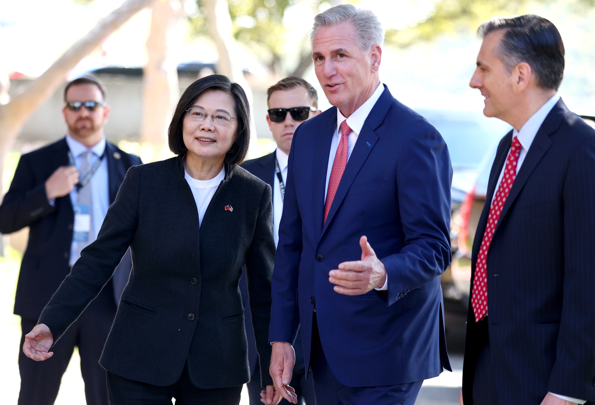 凯文·麦卡锡在4月5日在加利福尼亚州西米谷迎接台湾总统蔡英文。来源:美国北美盖蒂图片社一位资深中国外交官本周警告称,除非美国改变对中国的态度,否则就没有必要就如何维护世界两大经济体之间关系进行谈判。北京台湾事务办公室发言人朱凤莲周三表示,中国最新的军事演习是对台湾主张独立和“外部干涉”的严厉警告。
