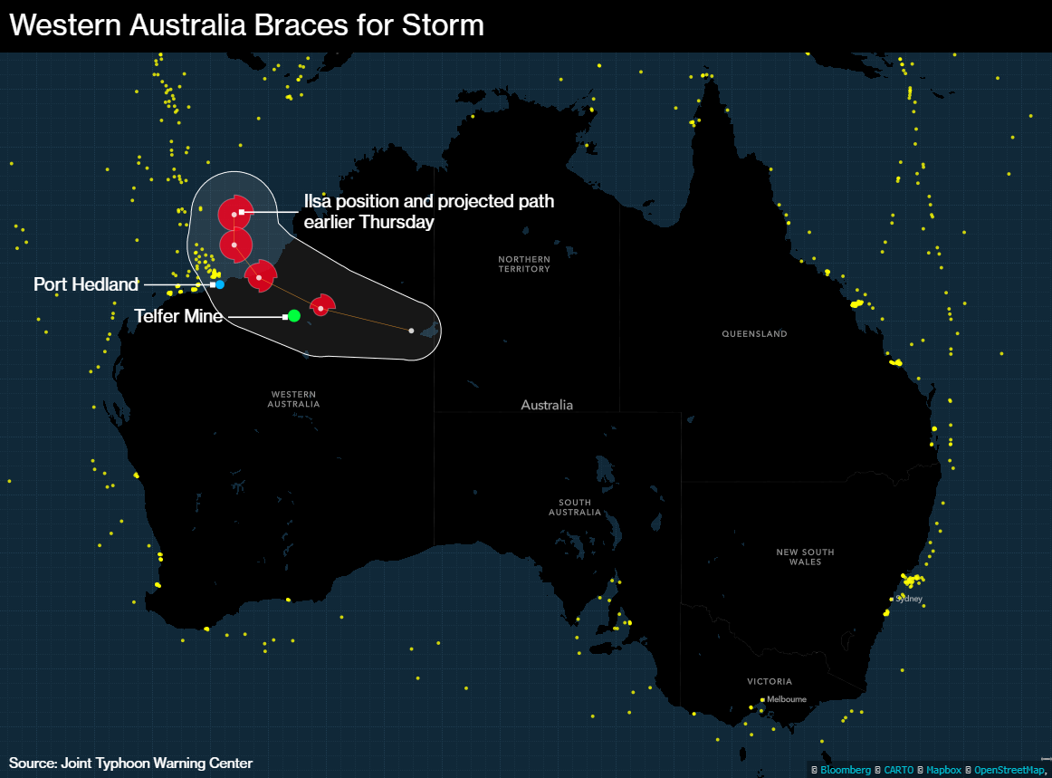4月13日的热带气旋伊尔莎。来源:CIRA/RAMMB澳大利亚西部州是从金属到天然气等大宗商品的主要生产地,气旋经常会导致矿山生产和港口出口停滞。新克雷斯特矿业有限公司 正在实施计划,逐渐停止其特尔弗矿山的生产,并将员工减少到骨干人员,因为伊尔莎预计会向内陆移动并给该矿山带来大雨。
