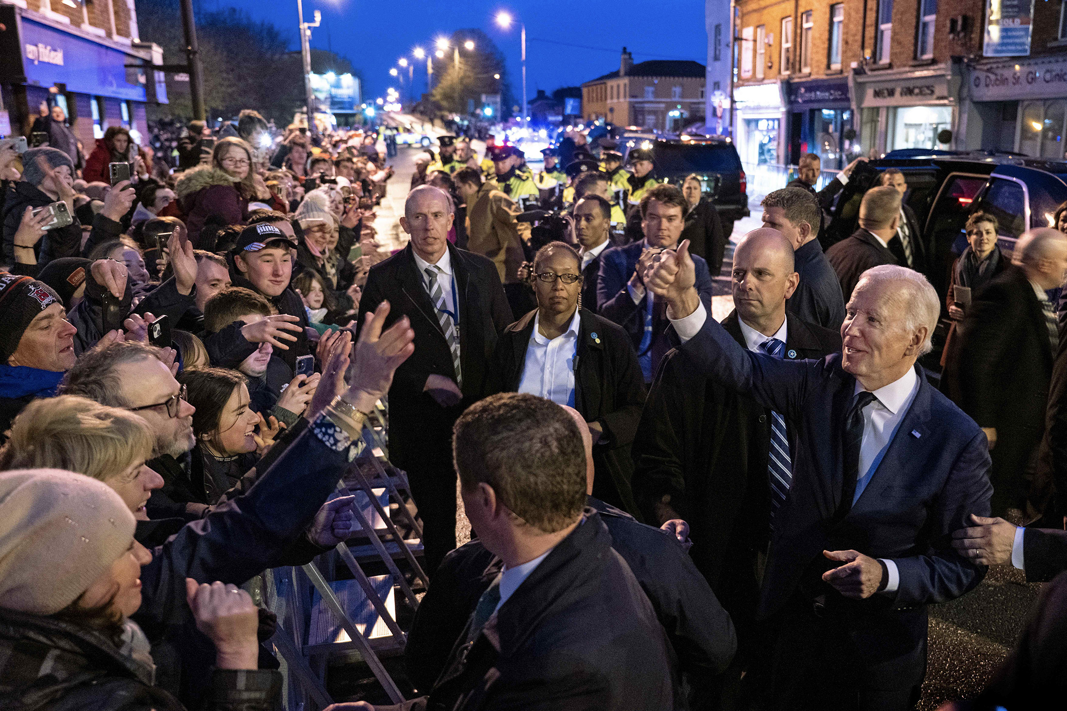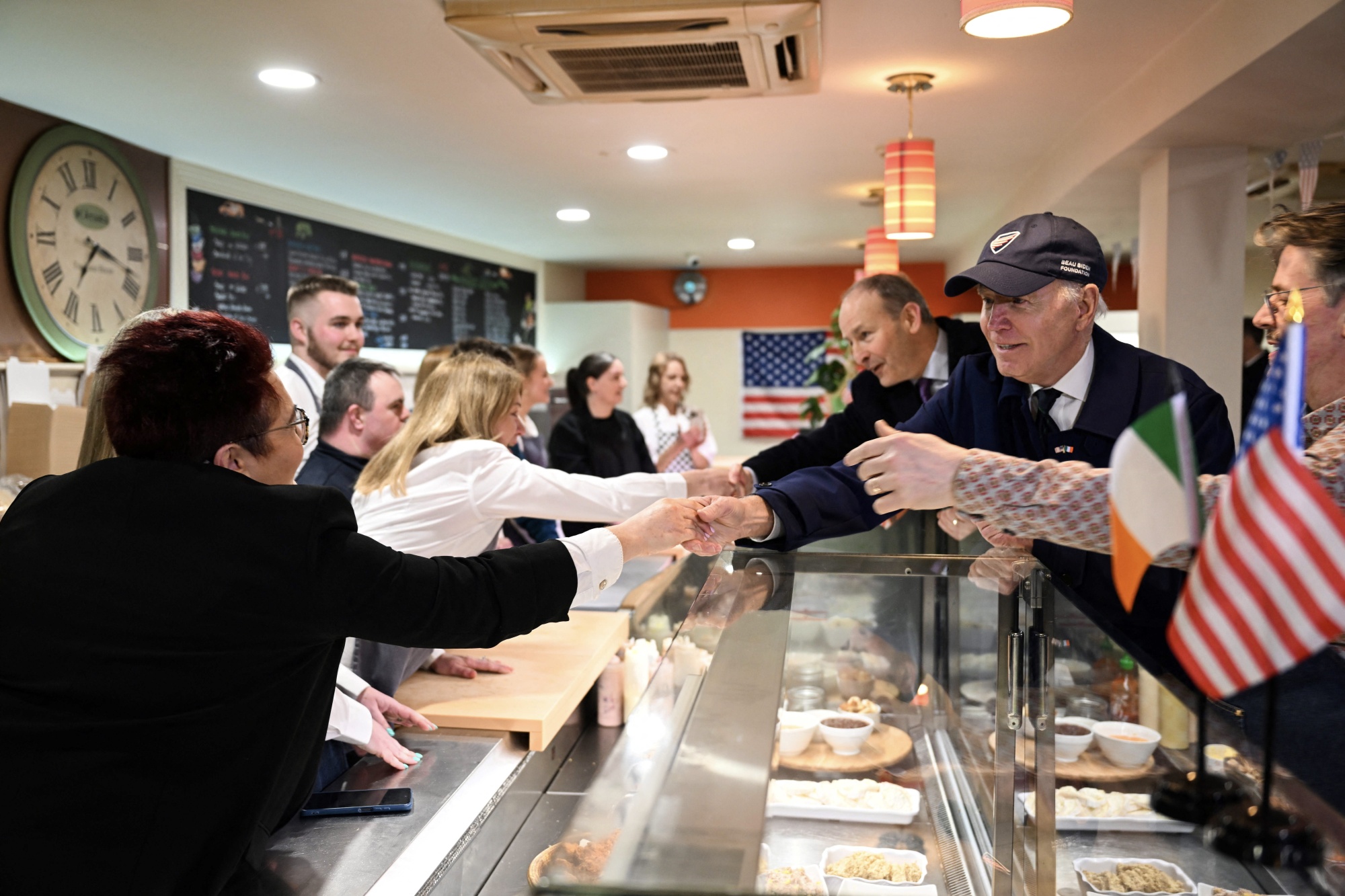 乔·拜登总统在爱尔兰邓多克的麦克提尔食品店,4月12日。摄影师:吉姆·沃森/法新社/盖蒂图片社在爱尔兰,他敲响了爱尔兰的团结钟,纪念《好周五协议》,该协议结束了北部大部分宗派暴力,他共敲响了四次。“这是为了我的爱尔兰祖先,”他说。