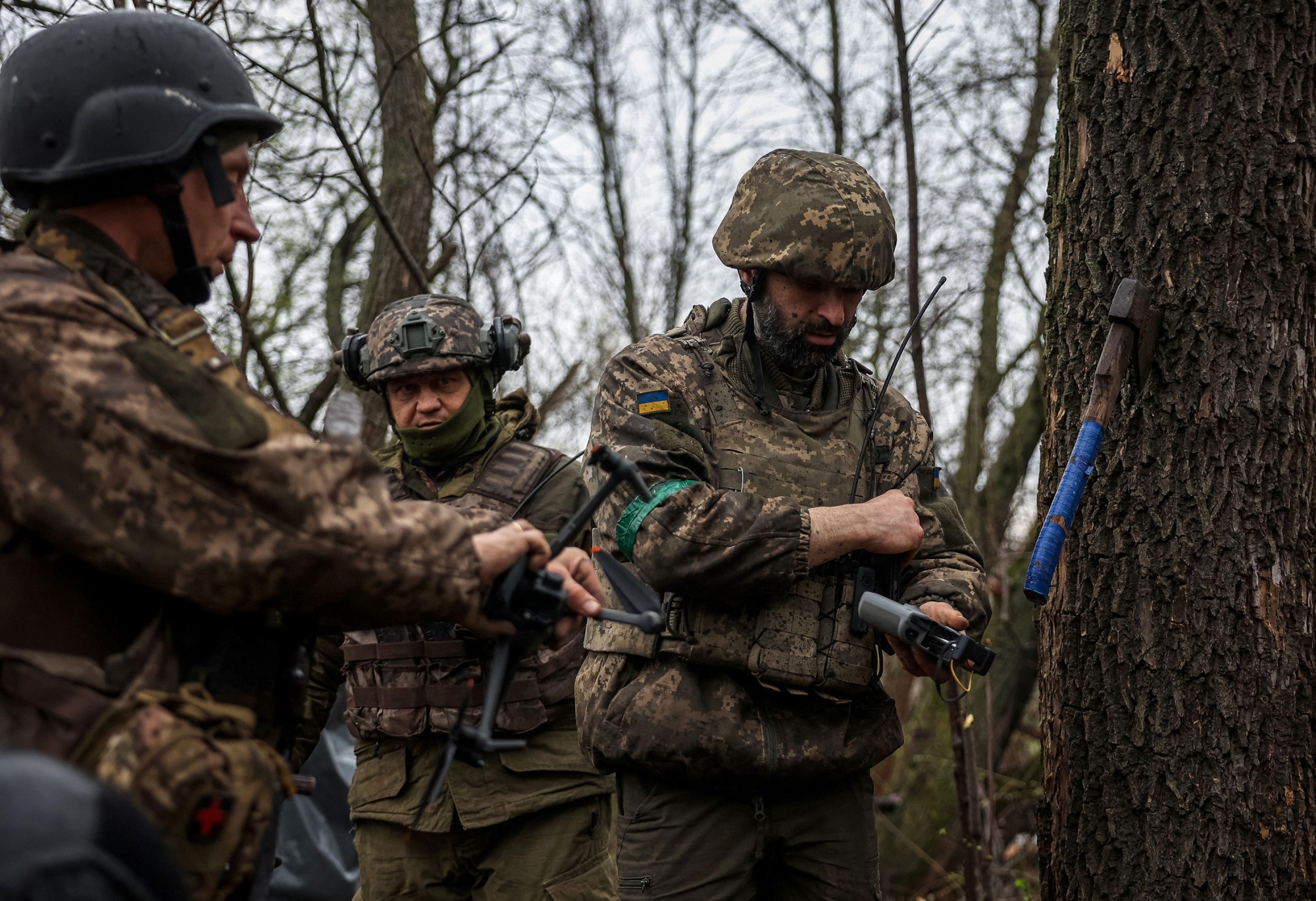 乌克兰步兵在4月13日在乌克兰东部准备一架无人机。