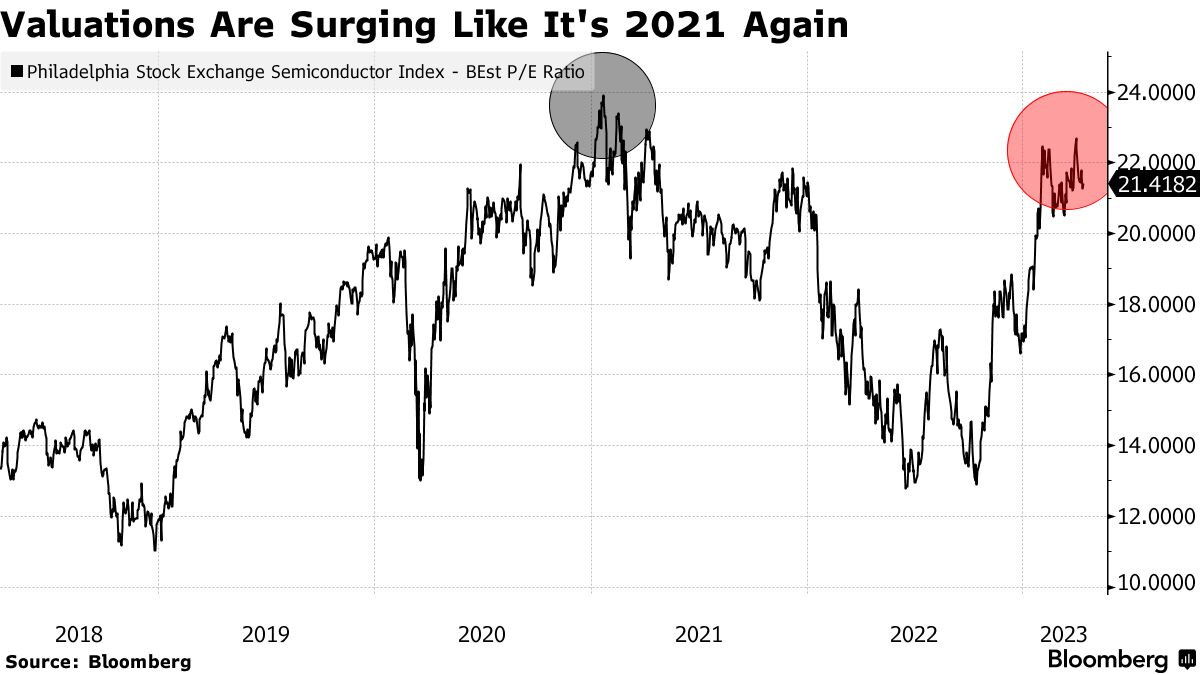 在第一季度暴涨28%之后,费城半导体指数的市盈率接近两年前的峰值水平,那时对从个人电脑到冰箱等各种产品的需求非常高,芯片制造商供不应求。问题在于,像美光科技公司这样的公司现在面临相反的问题——供应过剩。
