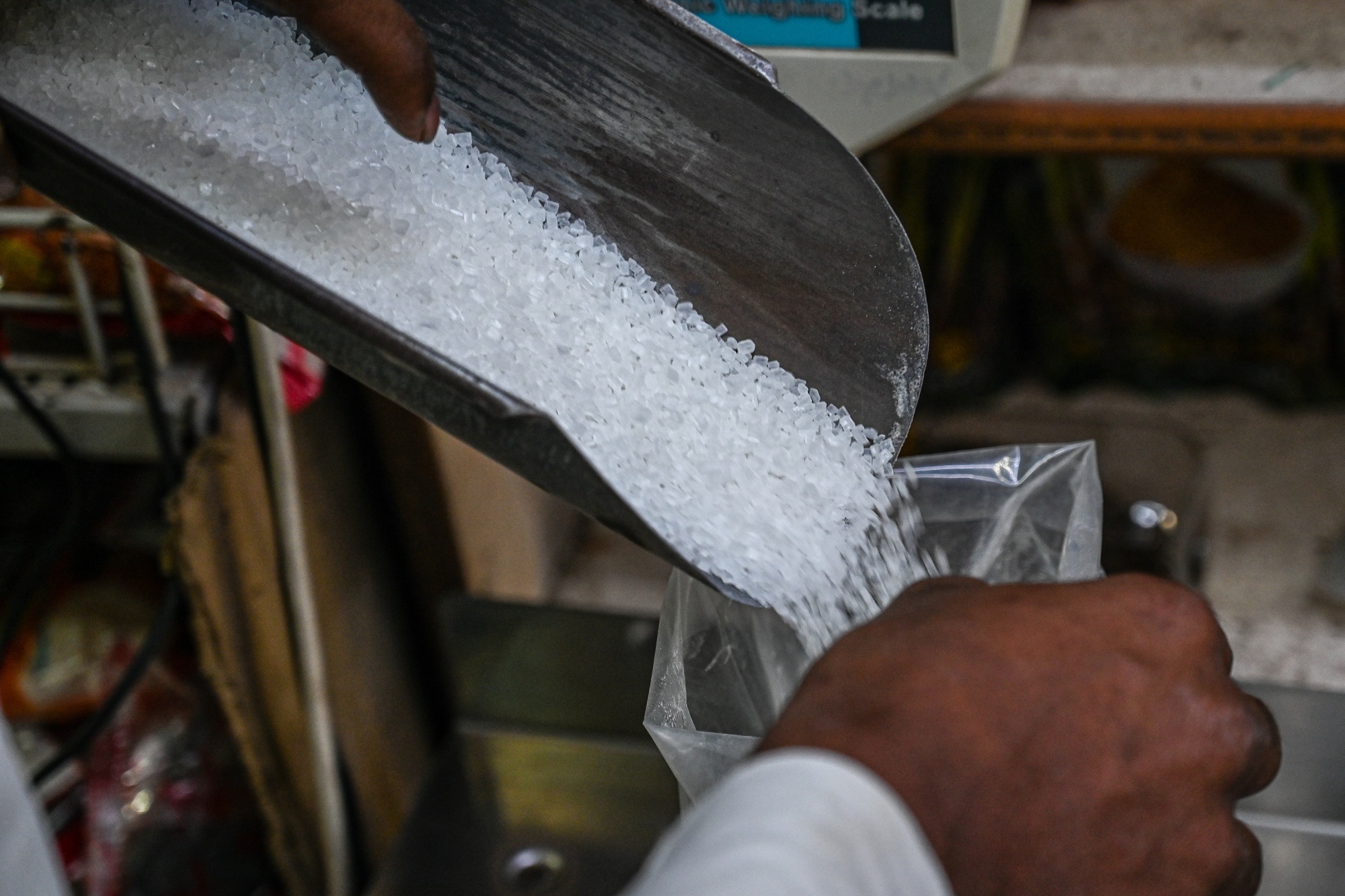 在印度北方邦梅尔特,一位杂货店老板为顾客称糖。