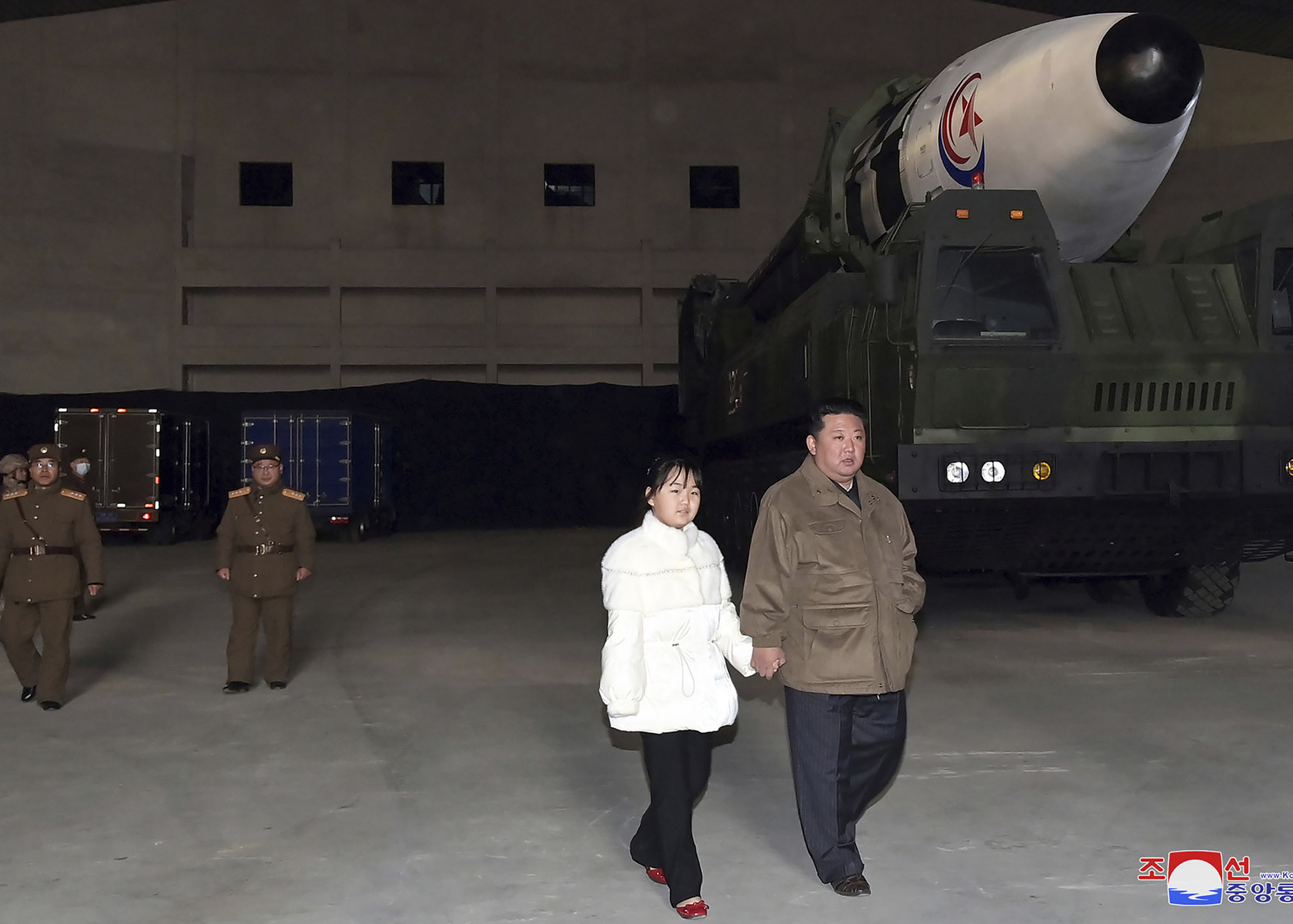 金正恩和他的女儿在11月18日在平壤国际机场检查导弹。来源:KCNA/KNS/AP照片在朝鲜全境的孩子们在学校度过这一天时,领导人金正恩的未成年女儿与父亲一起观看了一次旨在摧毁美国城市的新导弹的测试。