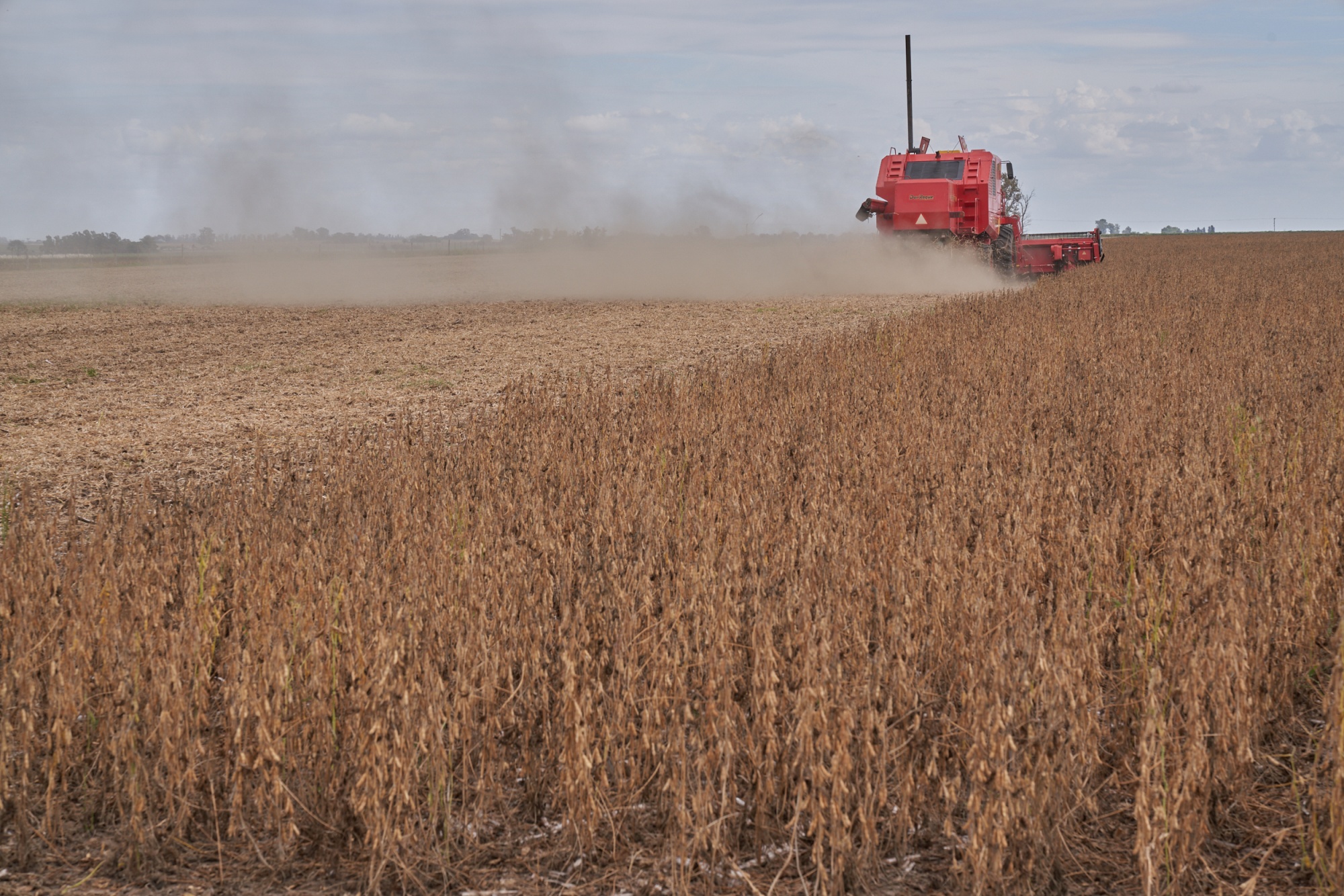 联合收割机在阿根廷圣何塞德拉埃斯基纳受干旱影响的农场中切割大豆植株,时间为4月6日。