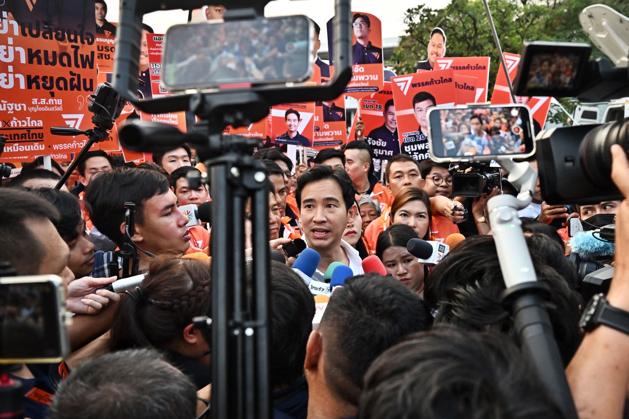 2020年未来前进党的解散——以及随后对其44岁 charismatique 领袖Thanathorn Juangroongruangkit的禁令——被视为引发当年后来的青年抗议的最初火花。尽管前进党继承了其前身的许多意识形态和旗舰议程,包括军事改革和改革国家政变后的宪法,但在皮塔的领导下,它还进一步成为唯一一个主流政党,推动修改侮辱皇室的法律,该法律最高可处以15年监禁。