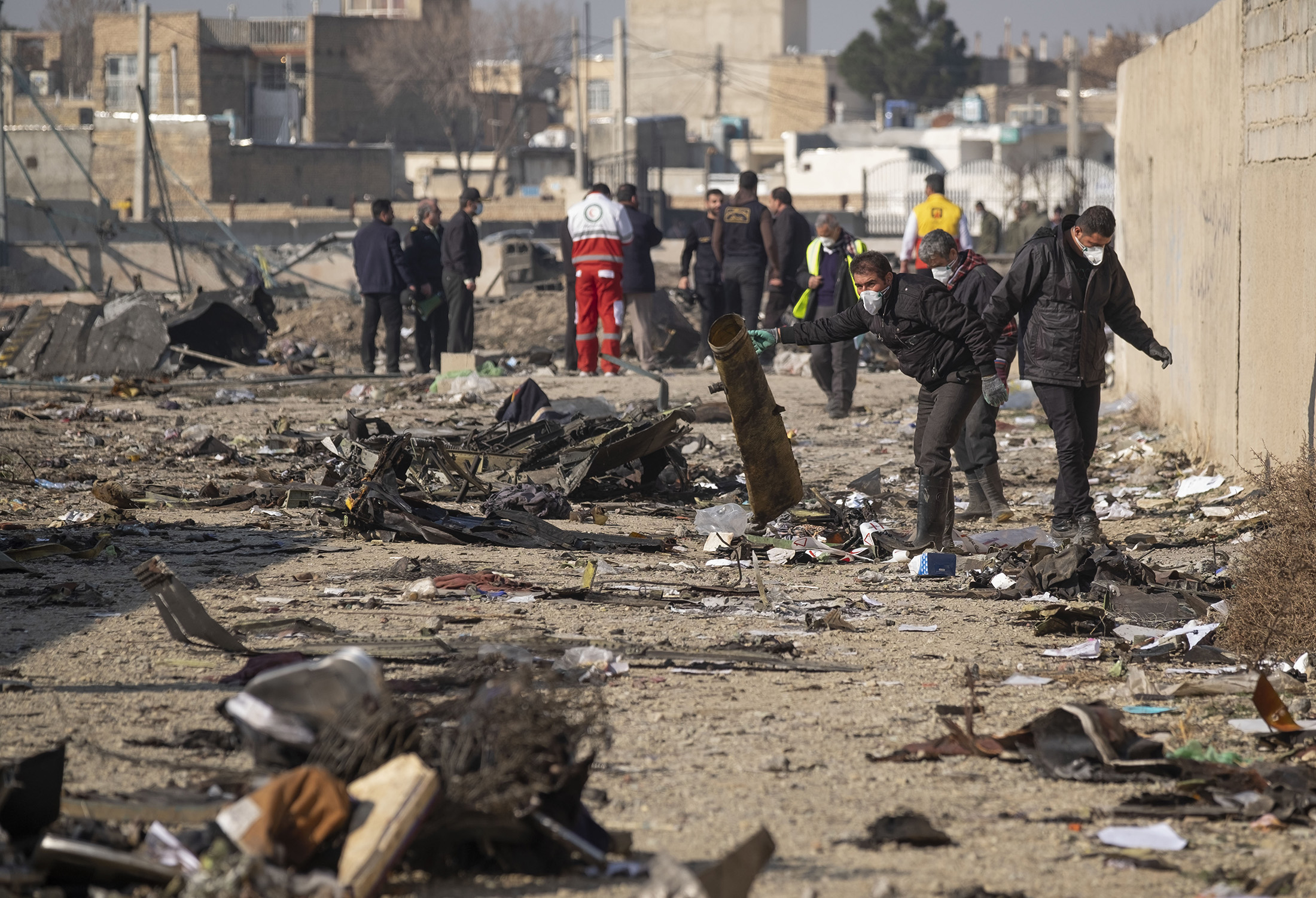 官员们在乌克兰国际航空公司PS752航班坠毁现场工作,该航班在2020年1月8日在伊朗德黑兰附近被击落。