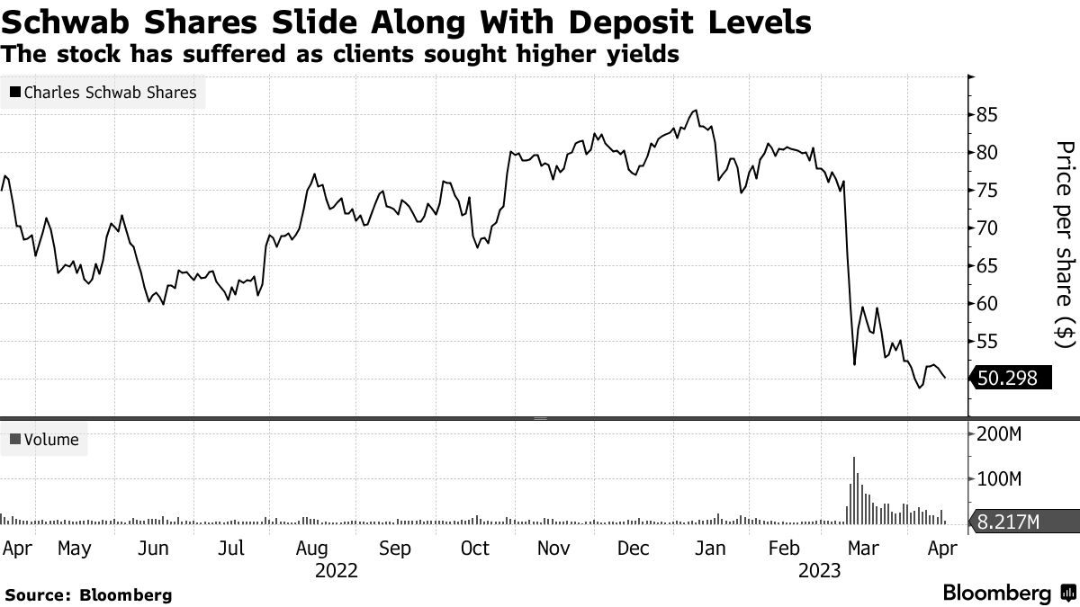 施瓦布的股价上涨了3.9%,收于52.77美元,今年以来下跌了37%。由于投资者关注银行持有的长期债务,该股遭受重创。