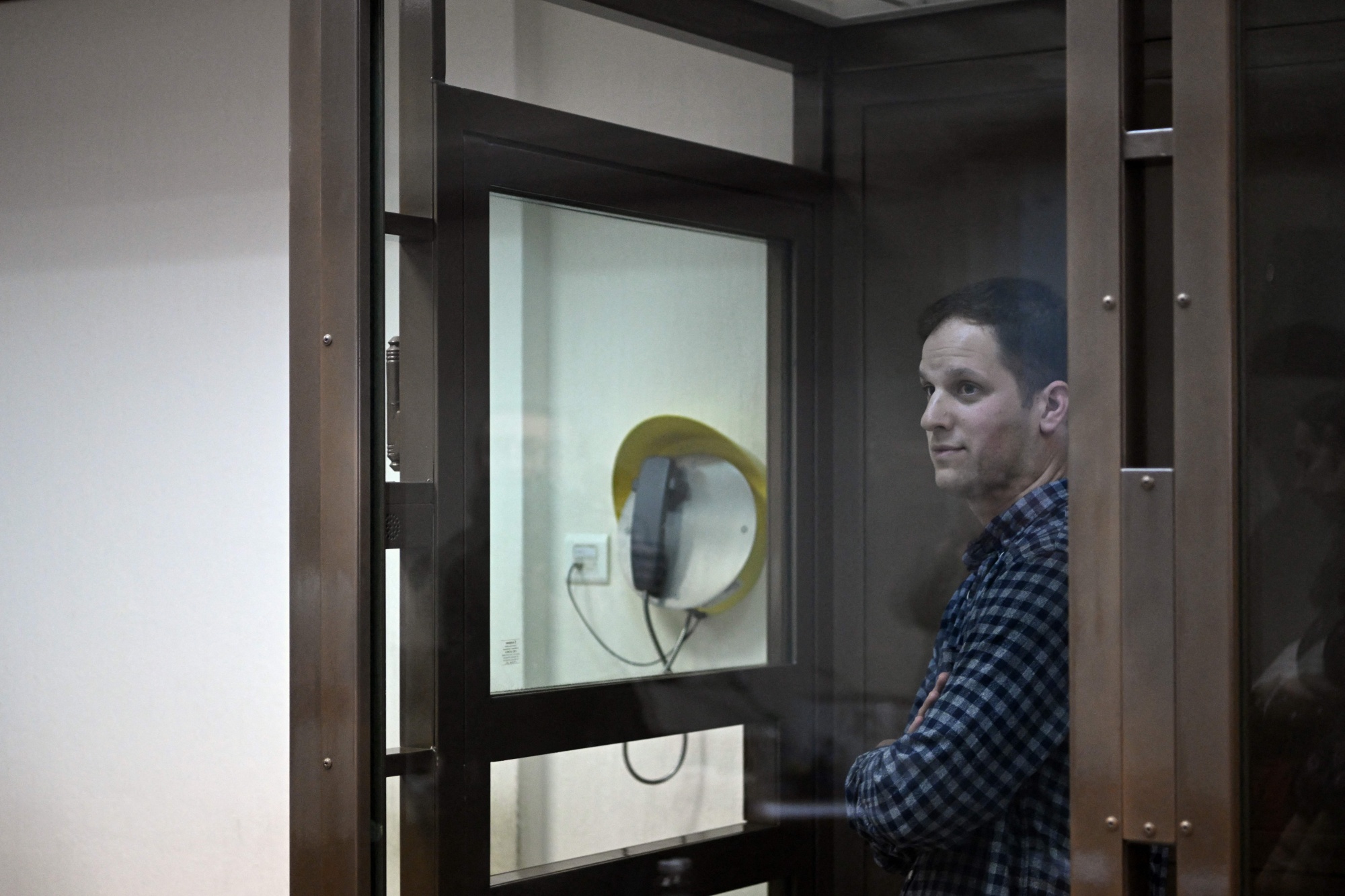 这位31岁的《华尔街日报》记者数周后首次公开露面,他身穿蓝色牛仔裤和深蓝色格子衬衫,站在莫斯科市法院的被告玻璃笼中。他时而抱臂踱步,时而透过一个开口与律师交谈,偶尔面带微笑,向挤满法庭的其他记者致意,然后因俄罗斯当局宣布此案为机密而关闭听证会。