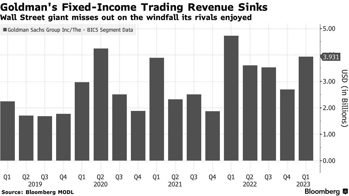 高盛集团的交易员未能利用上季度整个华尔街产生的固定收益繁荣,导致公司整体收入低于分析师的预期。