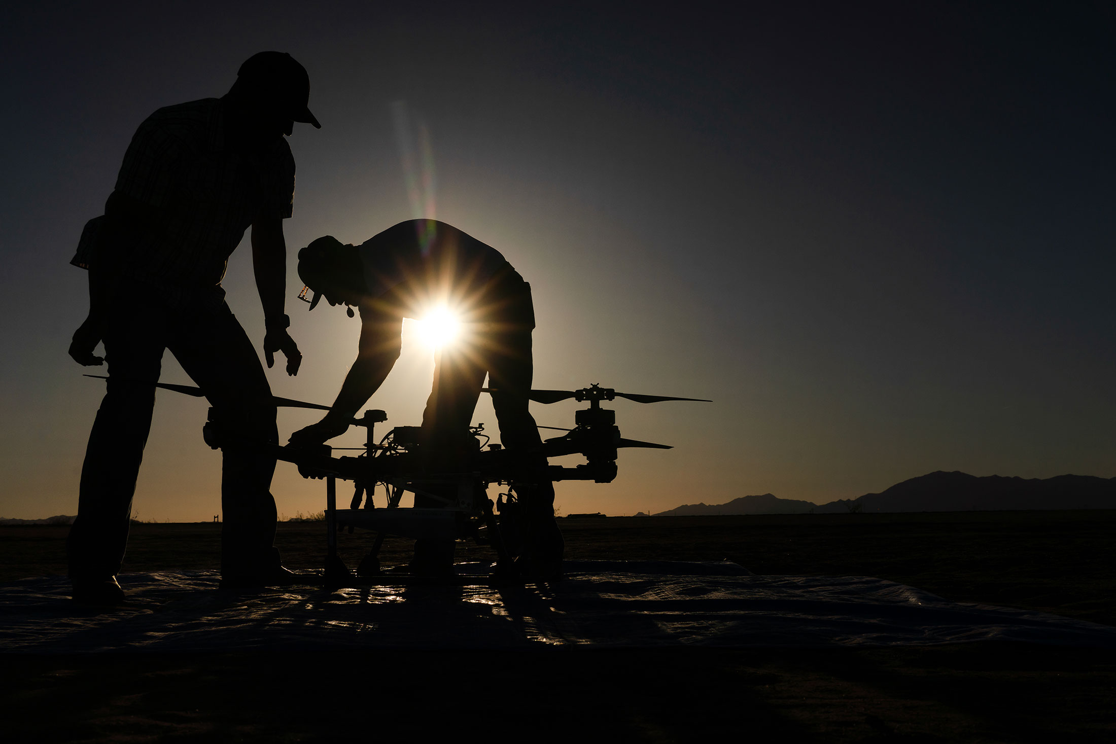 机组成员马克·里昂(Mark Lyon)、罗恩·格拉迪(Ron Graddy)和丹尼尔·彼得斯(Daniel Peters)将一架无人机降落。Precision AI还在研发一款完全自主的喷洒无人机,可以自主起飞、飞行和降落。目前的法规要求其无人机任务必须由人类操作员监督。摄影师:Rebecca Noble,彭博绿色[