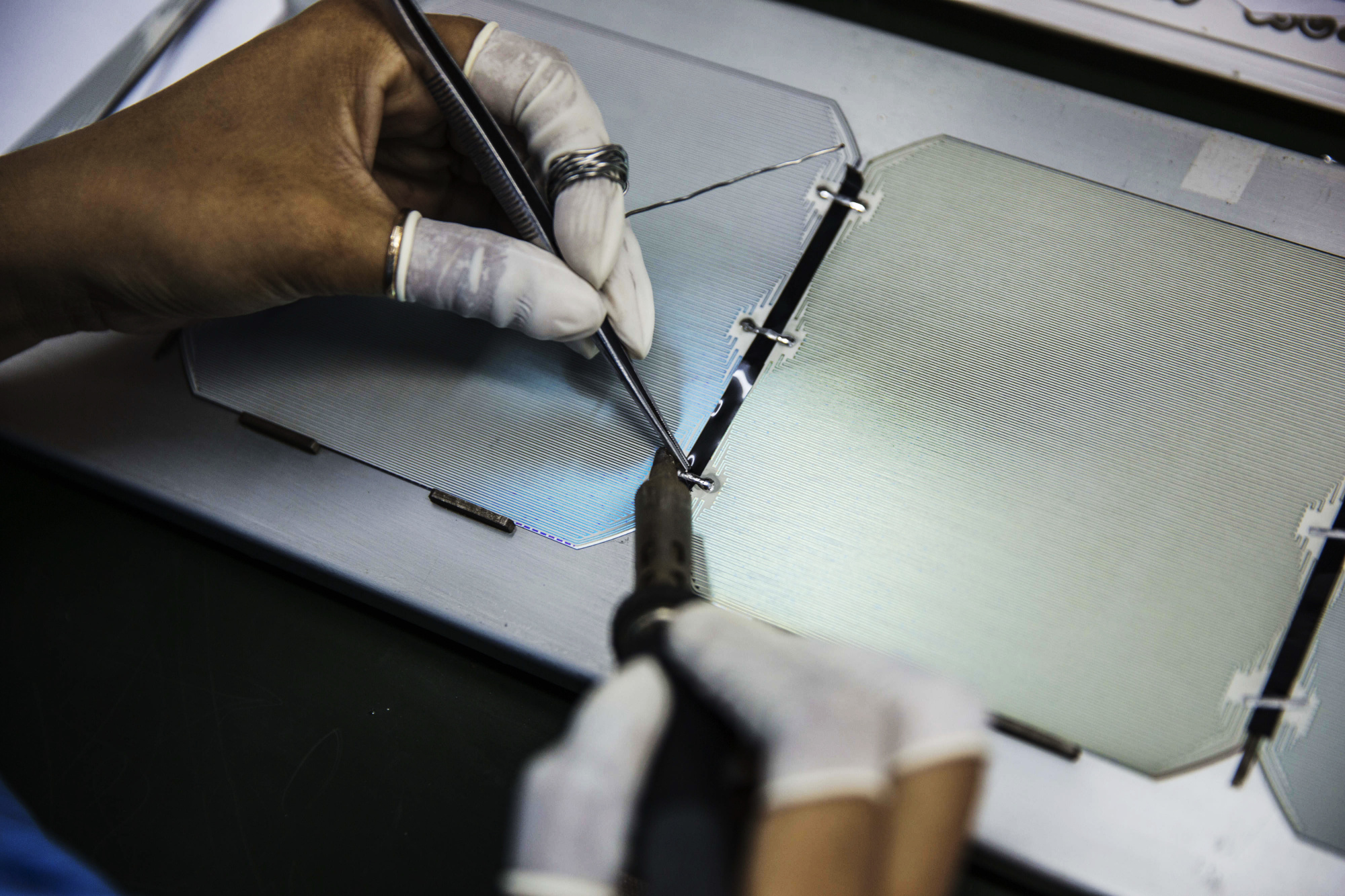 一名工人在柬埔寨的工厂里焊接太阳能电池模块。