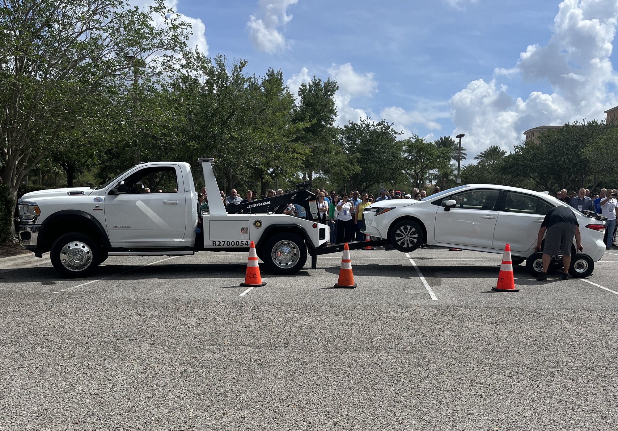 在会议室外停车场进行演示时,一名回收车辆代理商驾驶一辆来自亚特兰大拖车公司的白色Ram拖车,拖走了一辆混合动力丰田卡罗拉,并解释了检索角度和装载技术的最佳实践。他还强调了危险因素,比如当代理商面对汽车而看不到周围环境时:当你拖走别人的车时,背对着车辆是很危险的。—与**斯科特·卡本特