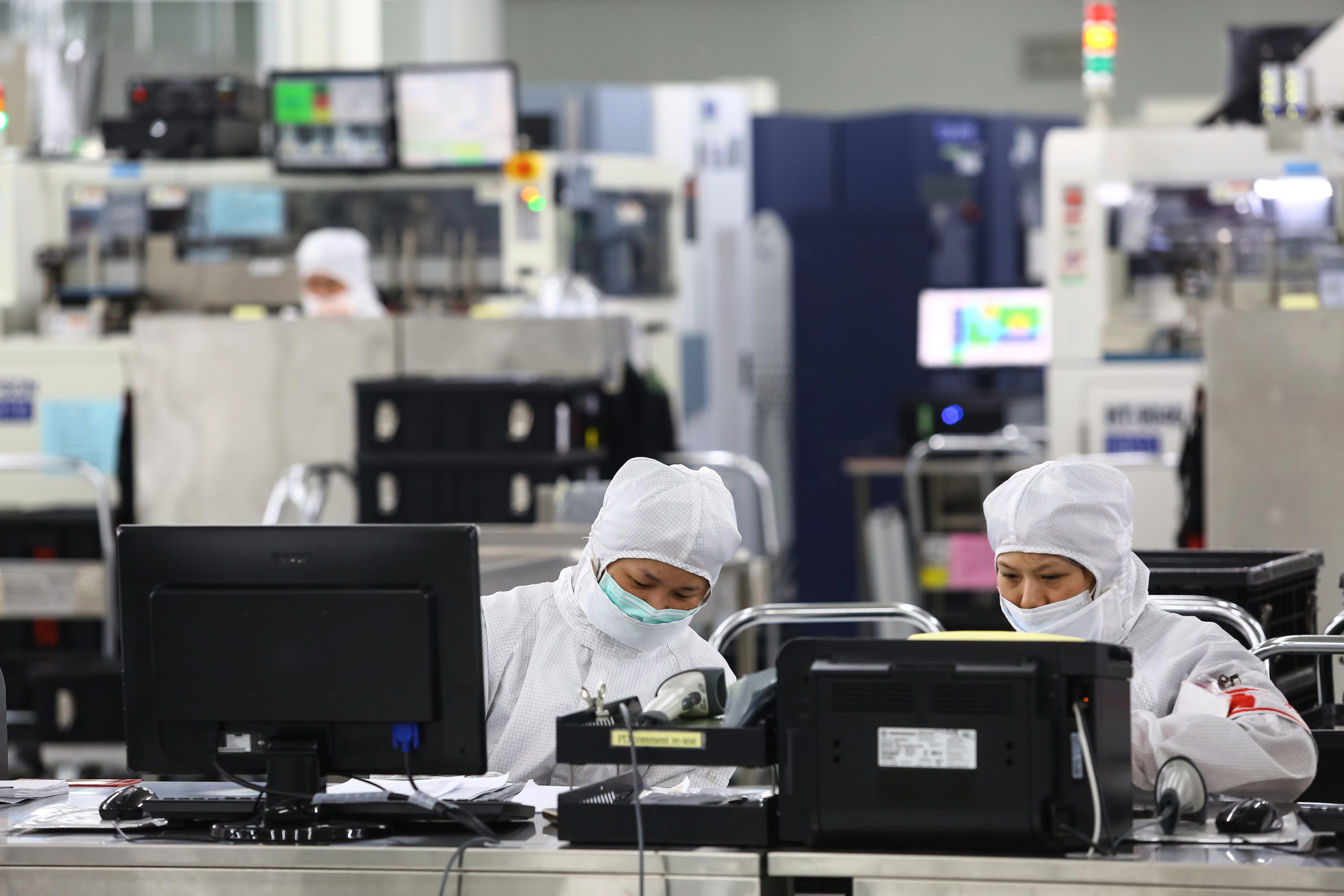员工在台湾新竹的半导体工厂内工作。