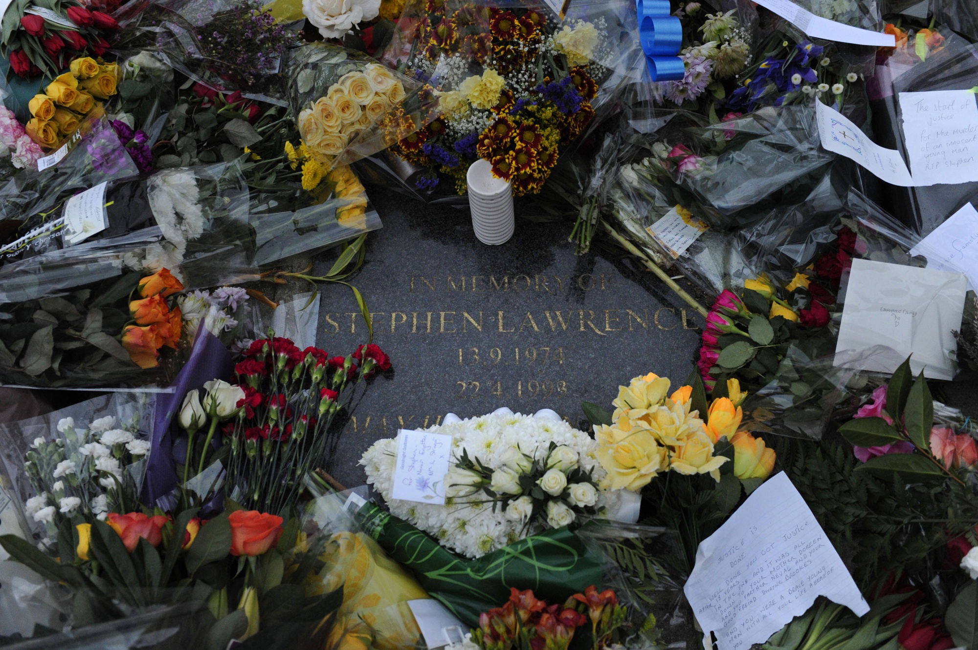在英国埃尔瑟姆,围绕着一块史蒂芬·劳伦斯纪念石的花朵被拍摄。