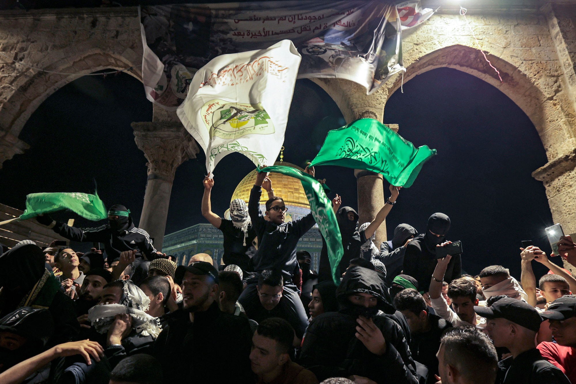 4月17日,年轻人在耶路撒冷的阿克萨清真寺广场挥舞旗帜。摄影师:哈泽姆·巴德尔/法新社/盖蒂图片社与此同时,美国在中东的参与已经减少,伊朗推进了其核计划。