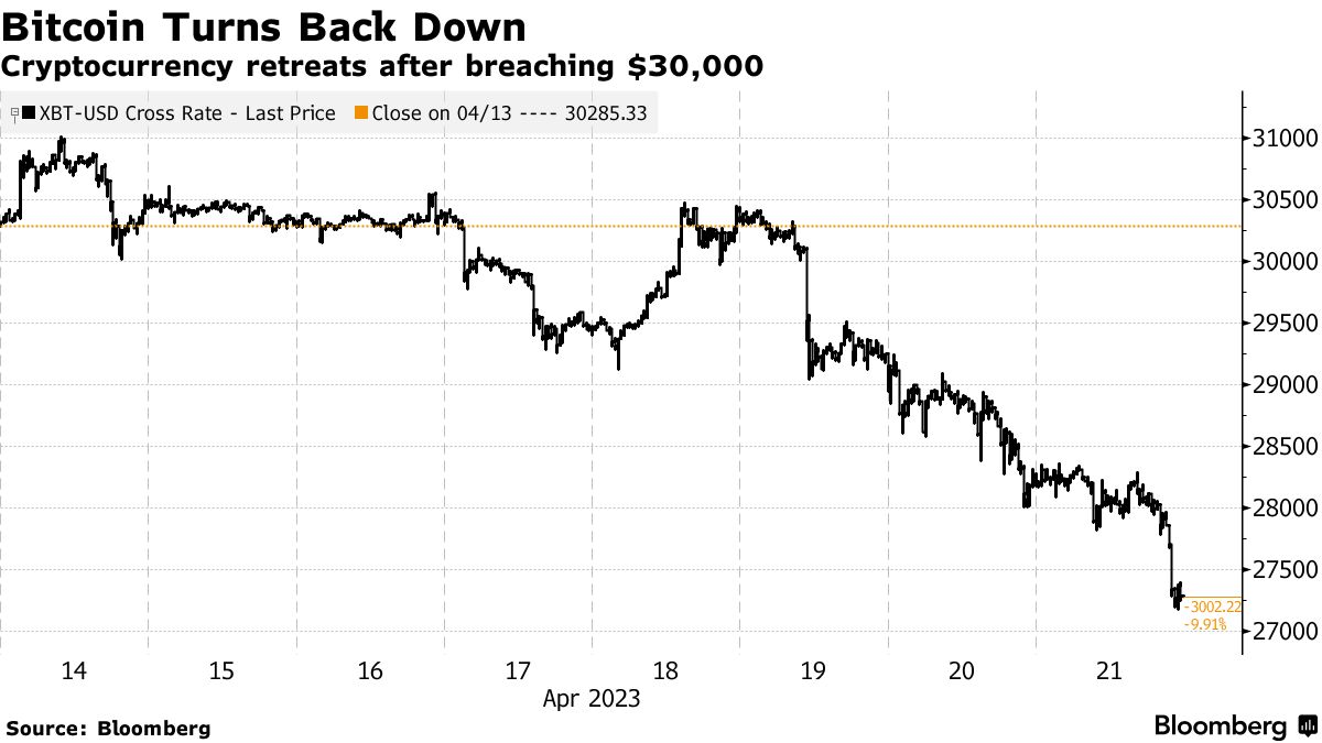 按市值计算的最大加密货币自上周日以来下跌约10%,至约27,300美元,结束了四周以来的首次周度下跌。比特币曾在3月14日飙升至31,013美元,今年已大幅上涨约65%,有助于缓解2022年类似规模的下跌带来的冲击。