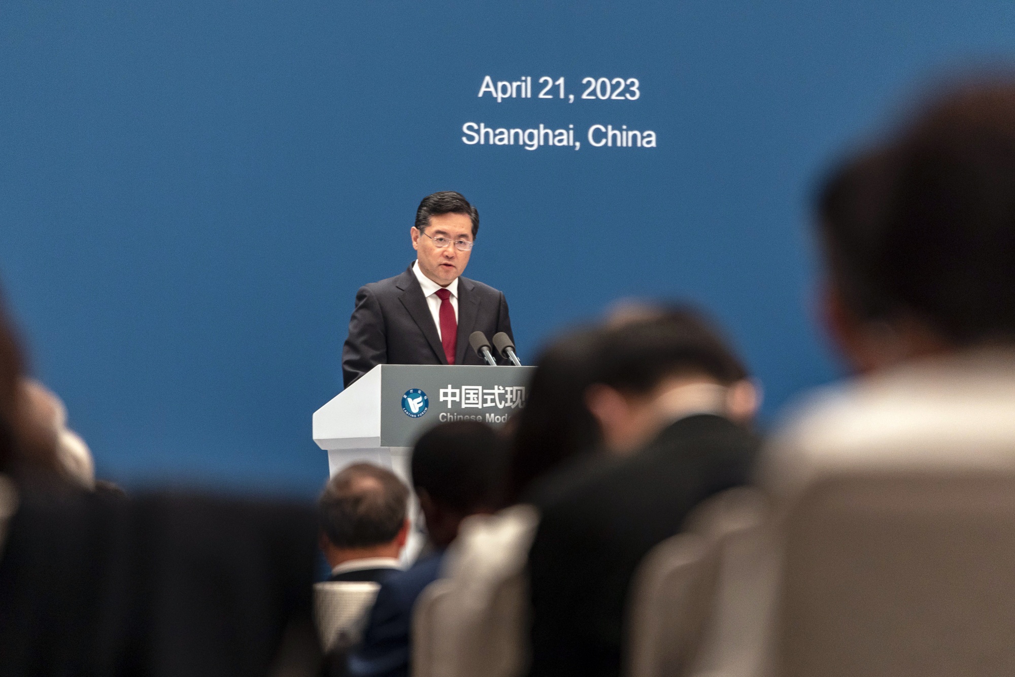 中国外交部长秦刚在2023年4月21日星期五在中国上海兰亭论坛上发言。摄影师:祁来申/彭博社秦刚还回击了有关中国改变台湾现状的指责,这些言论是在七国集团外长会议在日本提到需要对北京改变现状的举动进行抵制后发表的。