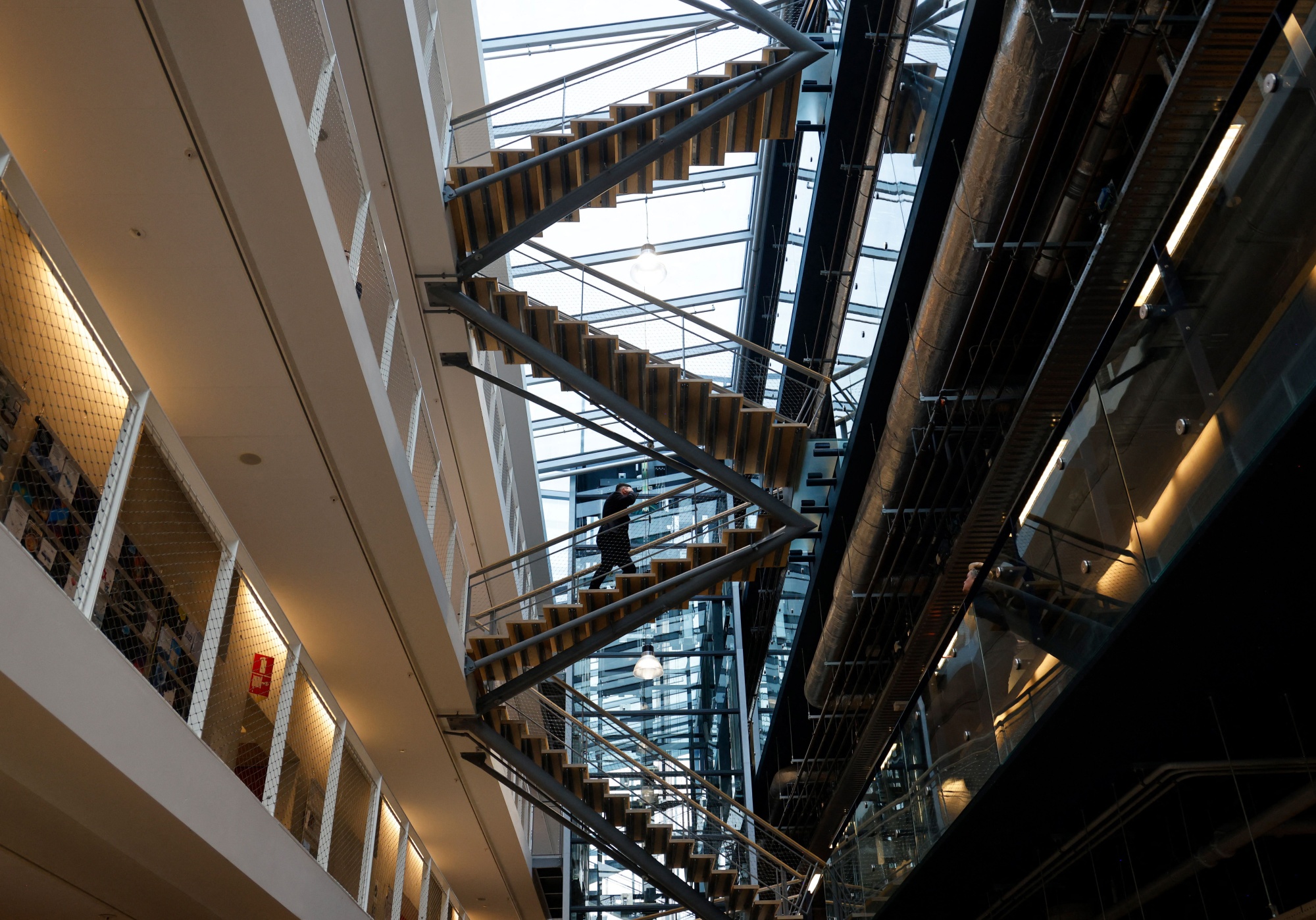 一名学生在阿姆斯特丹大学校园的楼梯上攀登。