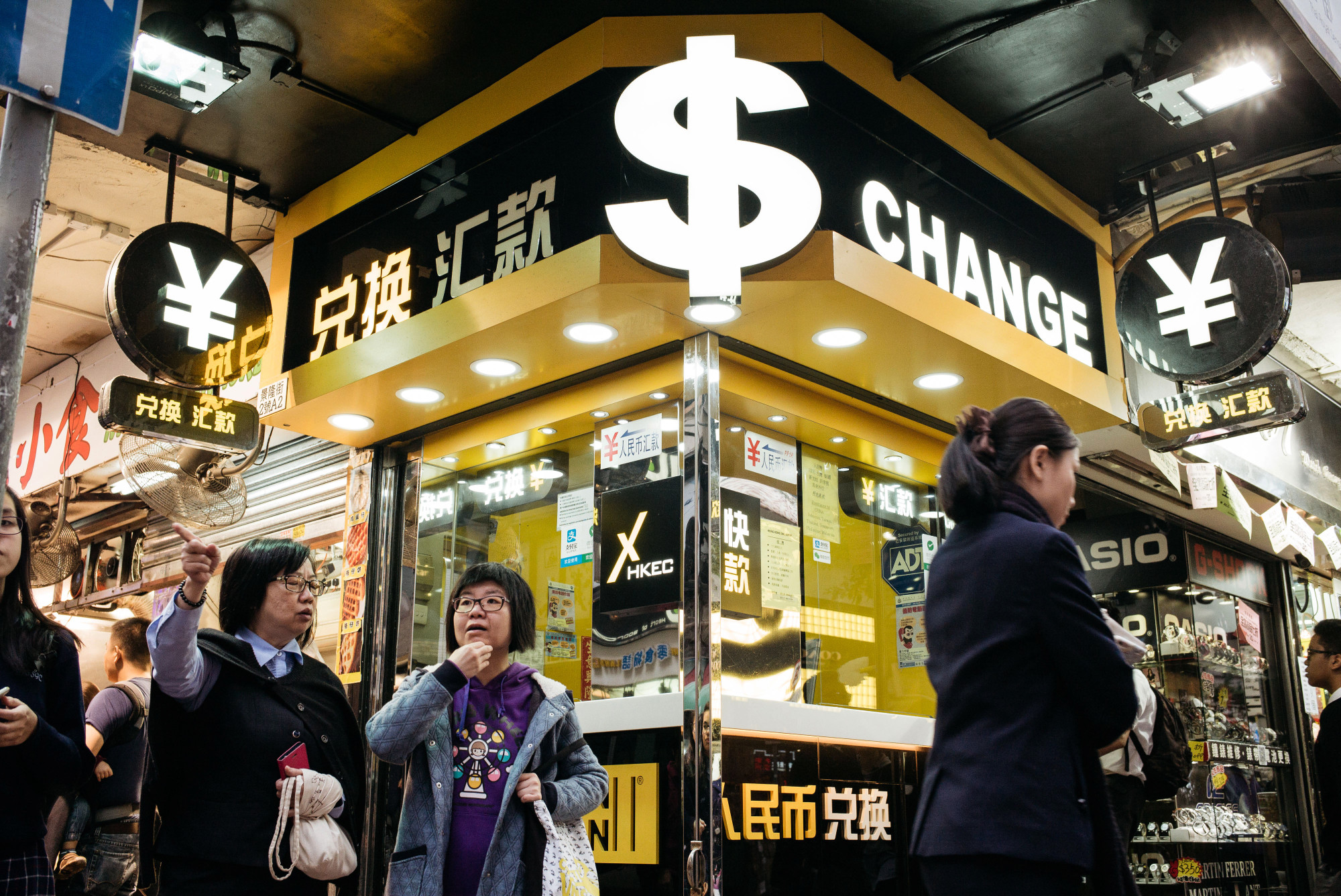 行人在2017年3月经过中国香港的一家货币兑换店。资金越来越多地通过在线方式转移。