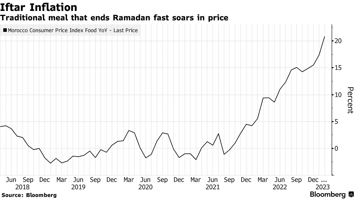 饥饿的穆斯林过去会在日落时分涌入这家摩洛哥餐厅享用伊斯兰斋戒快餐,但随着食品价格上涨20%,达到自1984年以来的最高水平,大部分座位仍然空着。经理穆罕默德表示,他无法支付西红柿、豆类、洋葱、鸡蛋和牛肉等传统菜肴的成本。