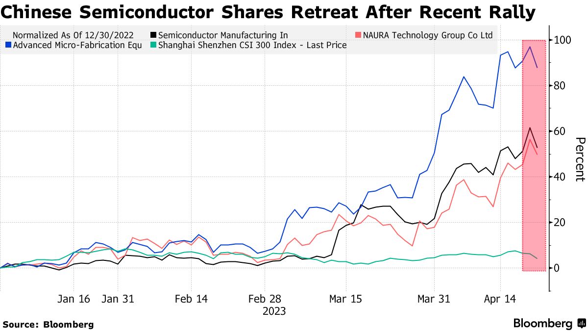 FactSet指数显示,周五,该国与芯片相关公司的股价下跌超过5%,将今年的涨幅缩减至15%。与在岸CSI 300基准的4.2%涨幅相比,先进微细加工设备公司和该国最大的芯片代工厂商中芯国际的股价仍然上涨超过50%。