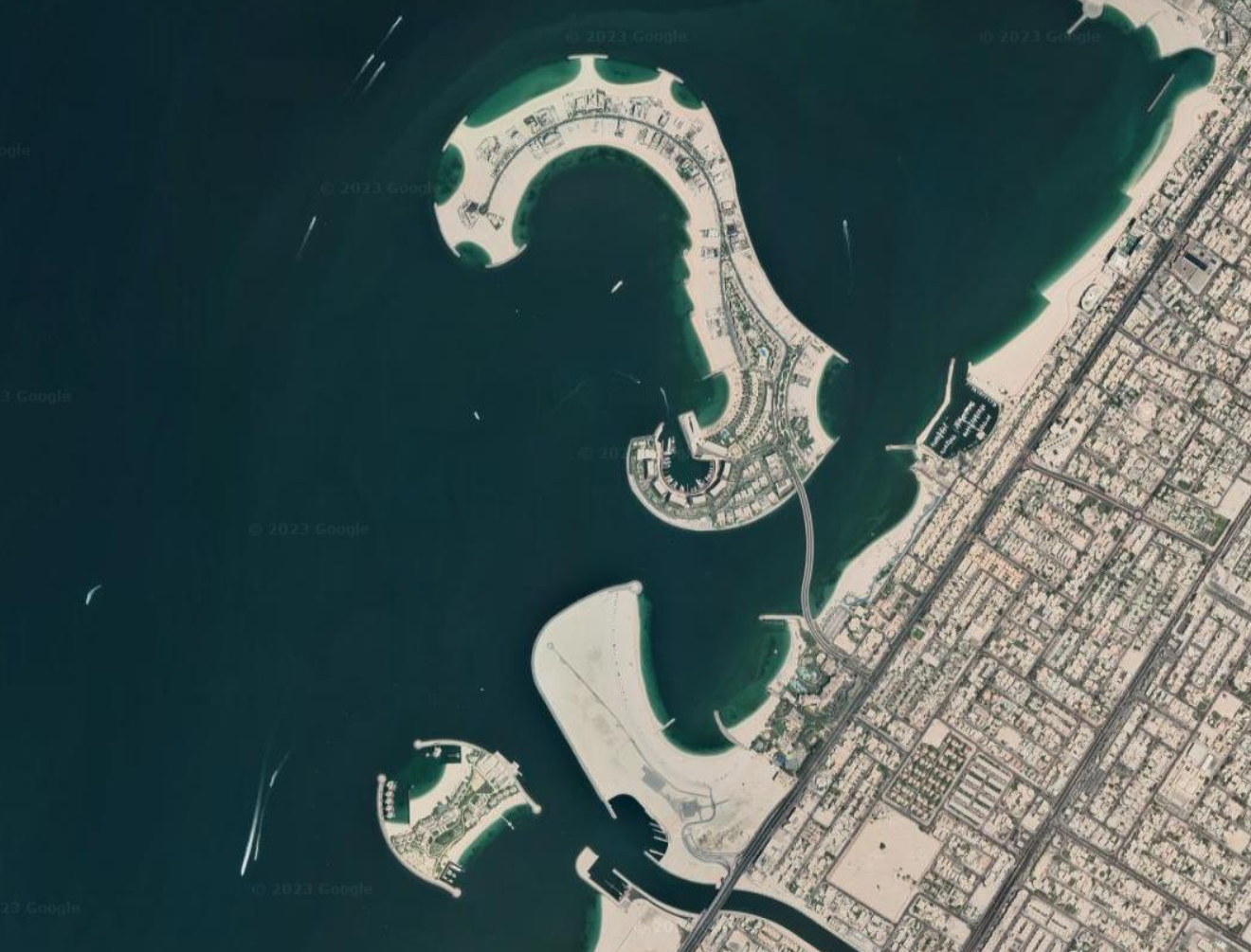迪拜海湾岛的卫星图,迪拜海岸外的房地产价格正在创纪录。来源:谷歌地图