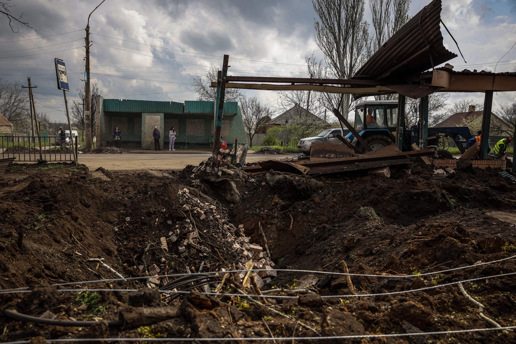 当地居民在4月24日,顿涅茨克地区克拉马托尔斯克一次导弹袭击留下的弹坑旁等待公交车。