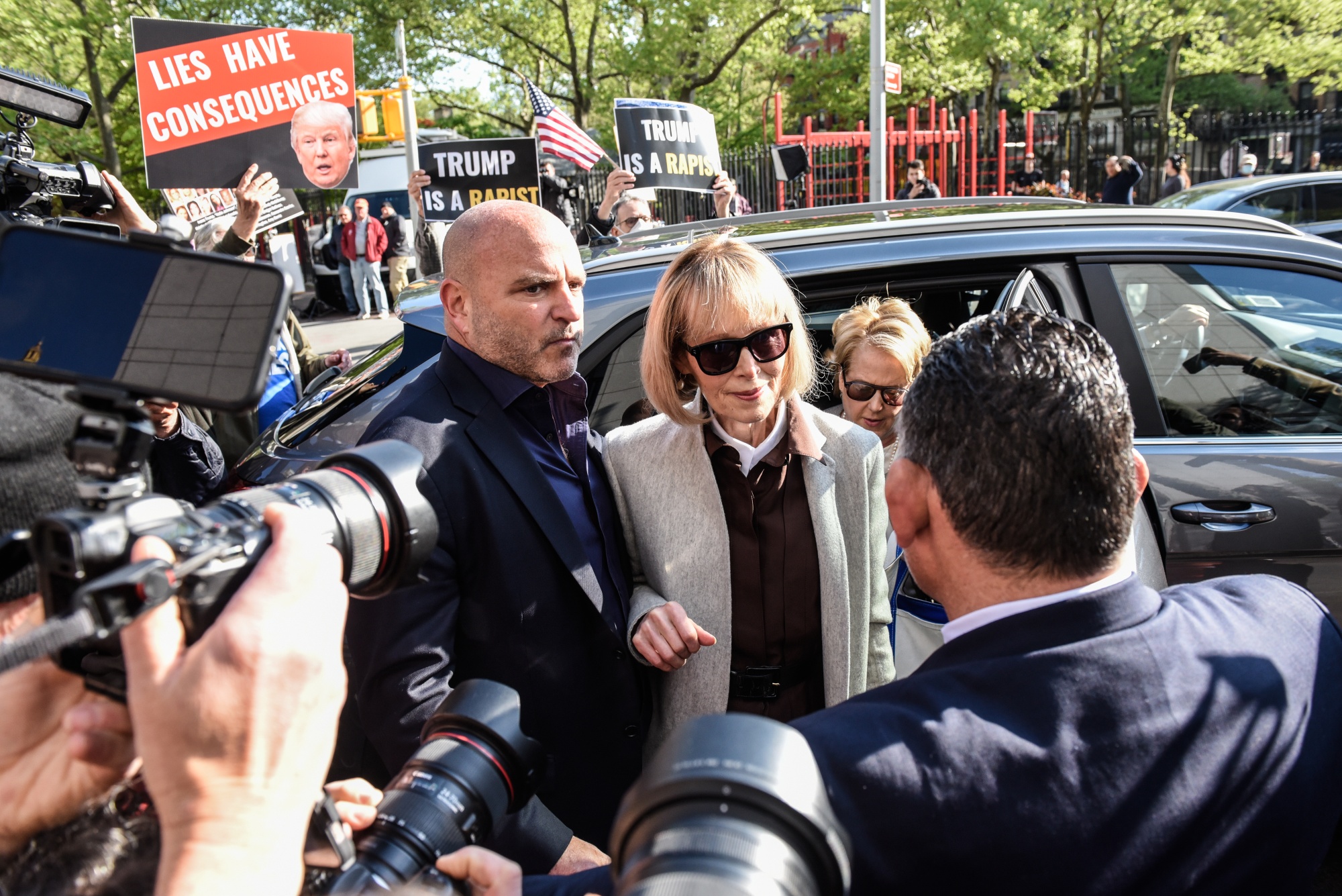 E. Jean Carroll,中间,于4月25日抵达纽约联邦法院。摄影师:Stephanie Keith/Bloomberg这位纽约作家起诉唐纳德·特朗普,声称他在1990年代在一家百货商店强奸了她,她详细描述了所谓的袭击,有时崩溃,并表示她甚至担心被指控后的反弹,曾购买子弹。