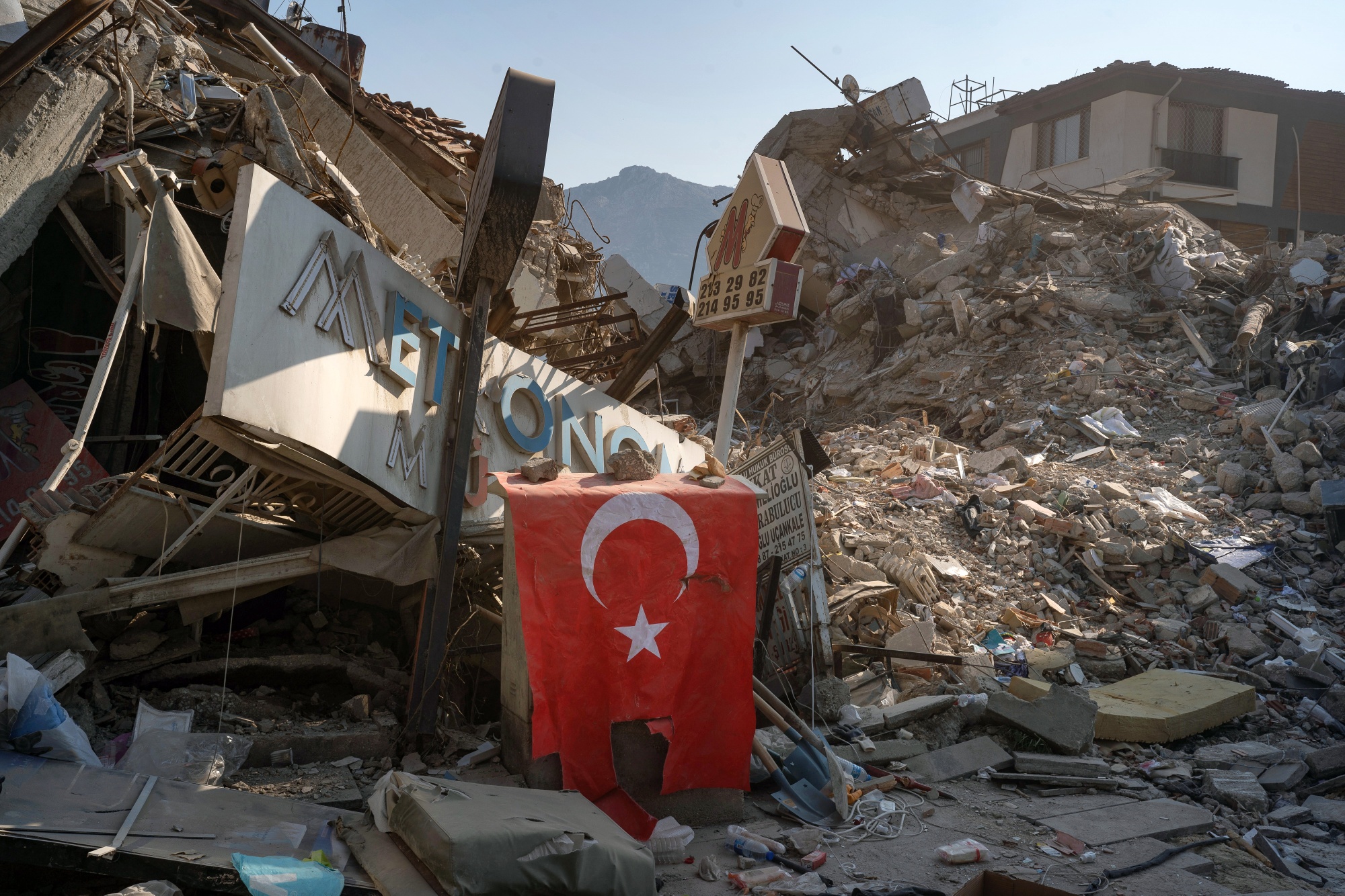 土耳其国旗放置在土耳其哈塔伊一处倒塌建筑物现场,日期为2月12日。摄影师:David Lombeida/Bloomberg