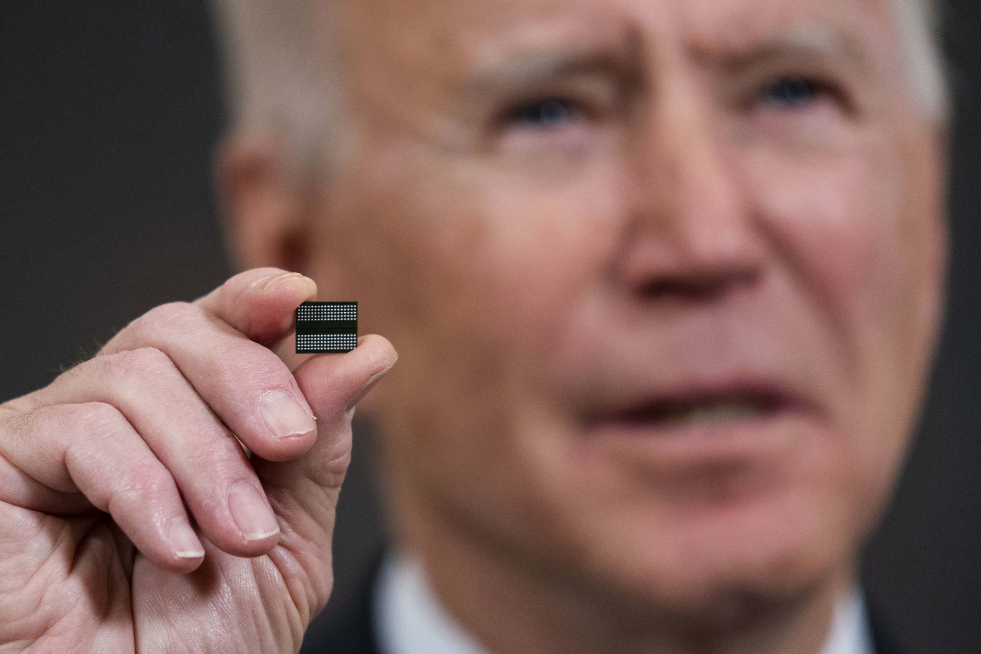 美国总统乔·拜登在2021年2月24日在华盛顿白宫签署行政命令前展示半导体。