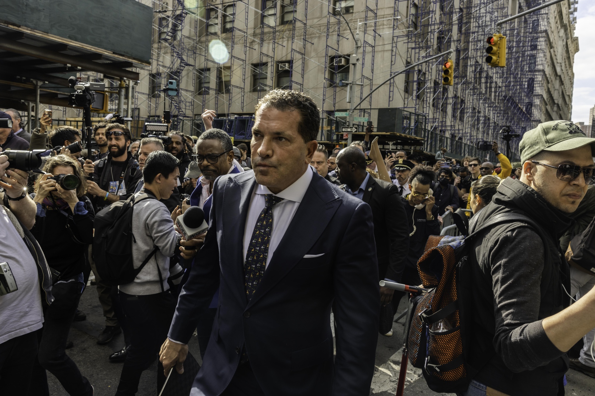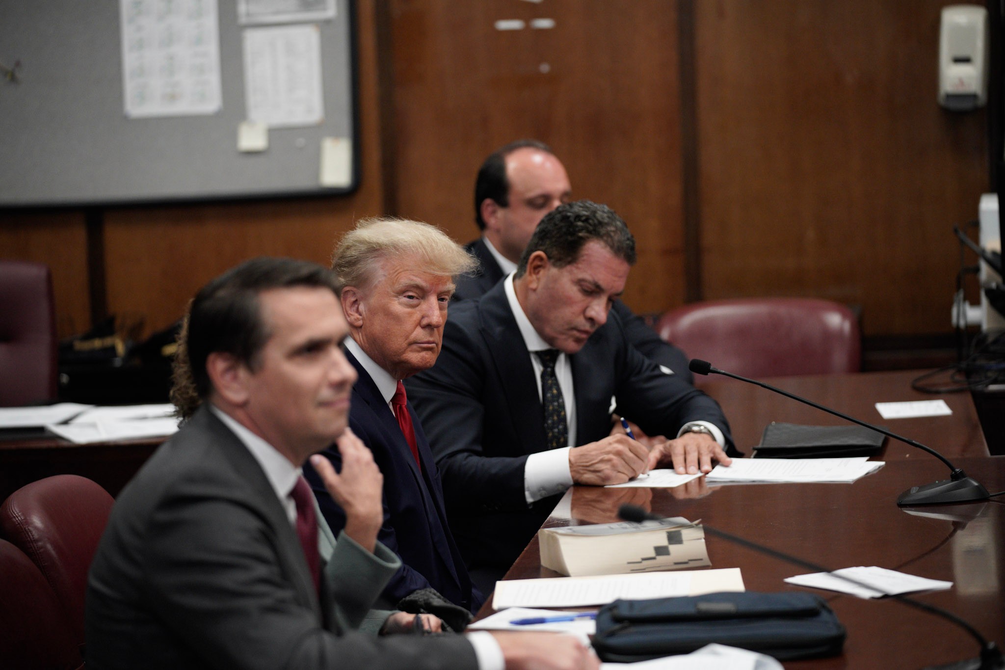 乔·塔科皮纳(Joe Tacopina)右边,在4月4日纽约特朗普的被告审判中,涉及另一起刑事案件中的封口费支付。