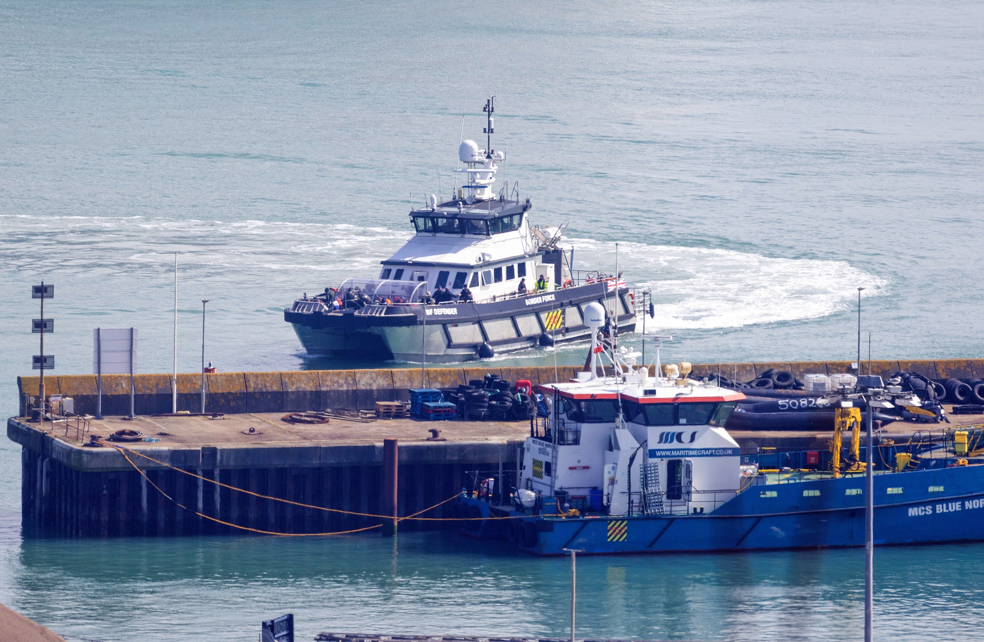 英国边境部队的“边境卫士”船只搭载在英吉利海峡上拾起的移民抵达英国多佛港有限公司,时间是4月5日。
