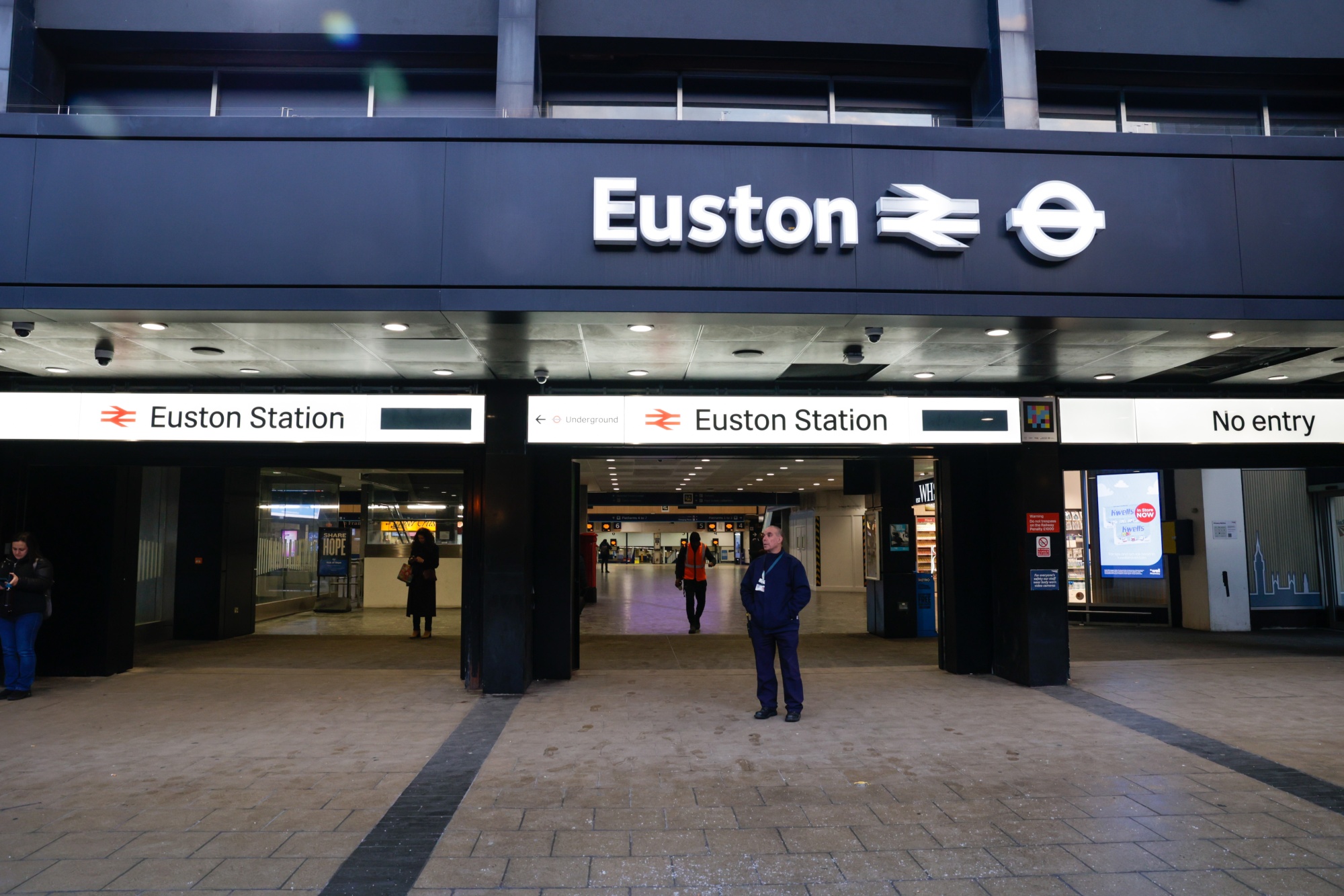 一名工作人员站在伦敦尤斯顿火车站外,进行罢工行动。