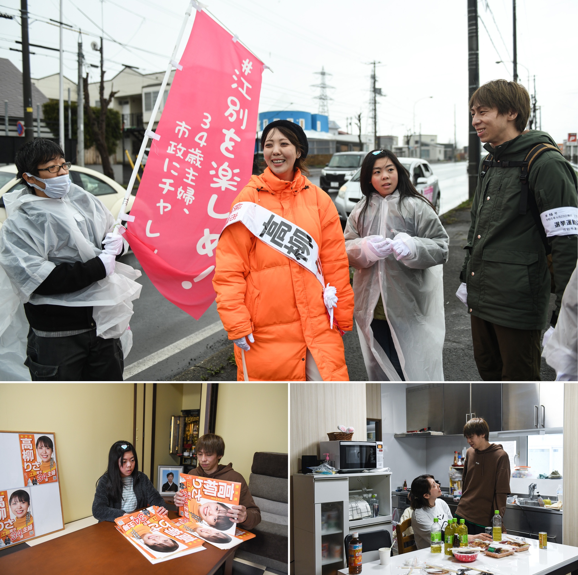 高柳理沙向家人和朋友寻求帮助,分发传单,张贴海报。她穿着一件明亮的橙色羽绒服和一顶黑色贝雷帽,驾驶着汽车穿过城市,在竞选的最后一周,停在几个社区发表演讲,与选民握手,并分发竞选宣传资料。