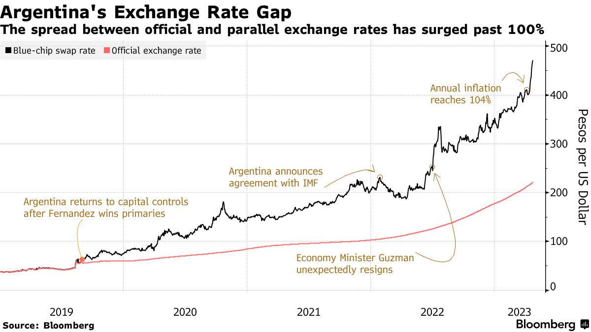 据说政府正在加大对券商的压力,要求提交关于平行汇市交易的报告,并对一家声称贬值即将发生的公司展开调查。比索上周在这个用于规避货币管制的替代市场中暴跌了13%,而数据显示,三月份消费者价格飙升了104%,是三十年来最快的增长速度。