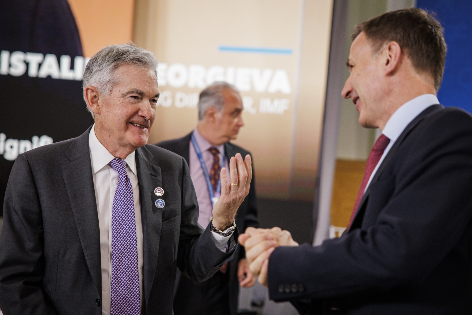 美联储主席杰罗姆·鲍威尔本月早些时候在国际货币基金组织和世界银行春季会议上与英国财政大臣杰里米·亨特交谈。