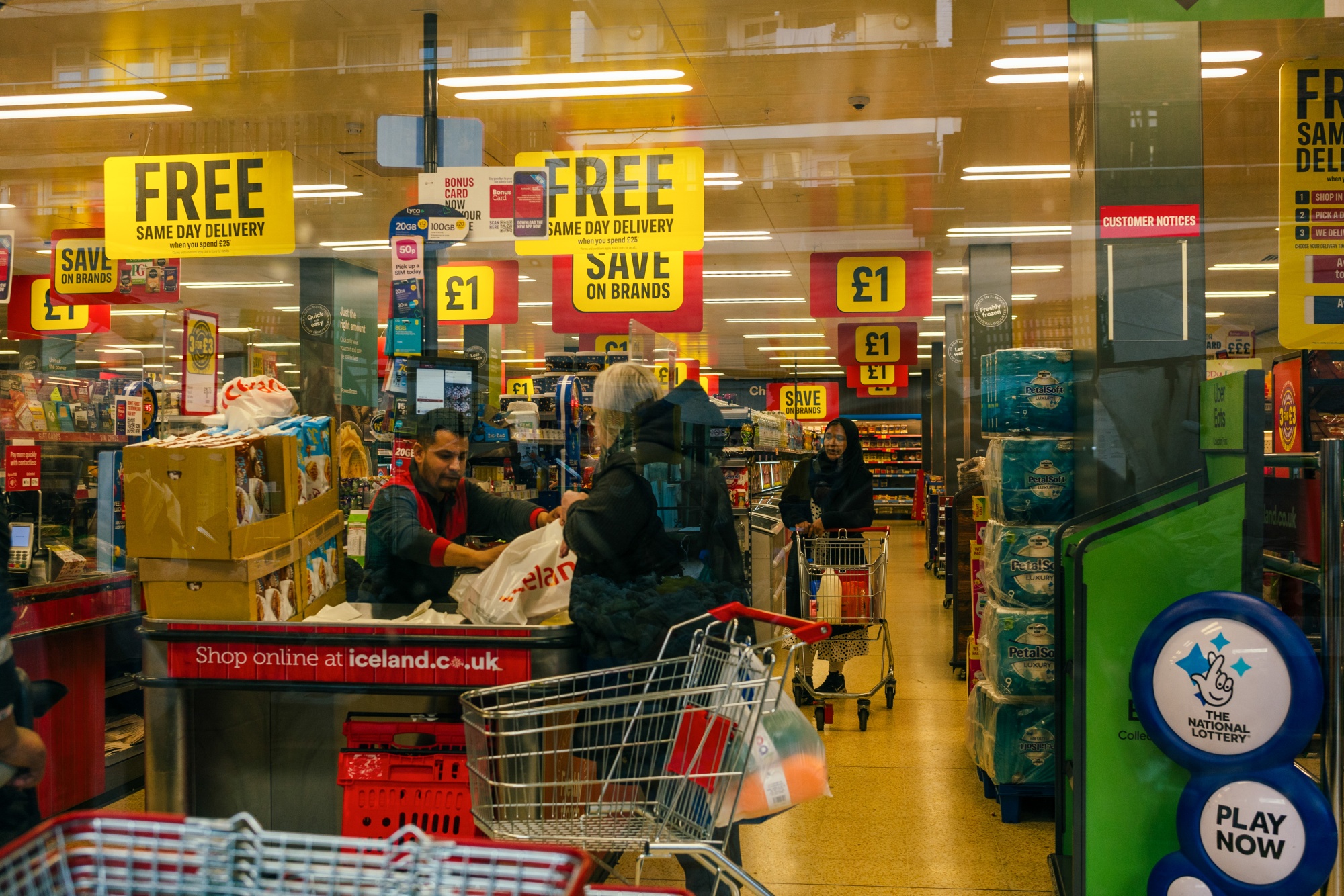 伦敦一家冰岛食品超市的收银台处的顾客。