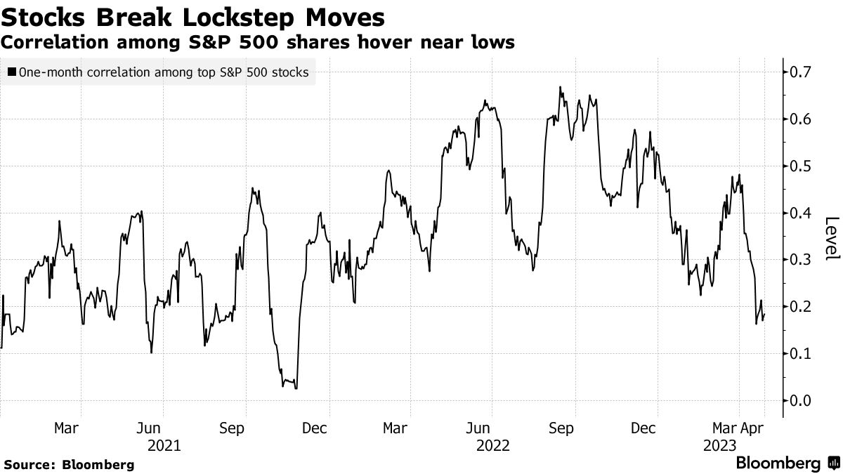 由于这种轮换,2022年熊市期间的同步波动基本消失了。四月份,标普500股票之间的一个月实现相关性接近0.5。现在,它已经低于0.2。