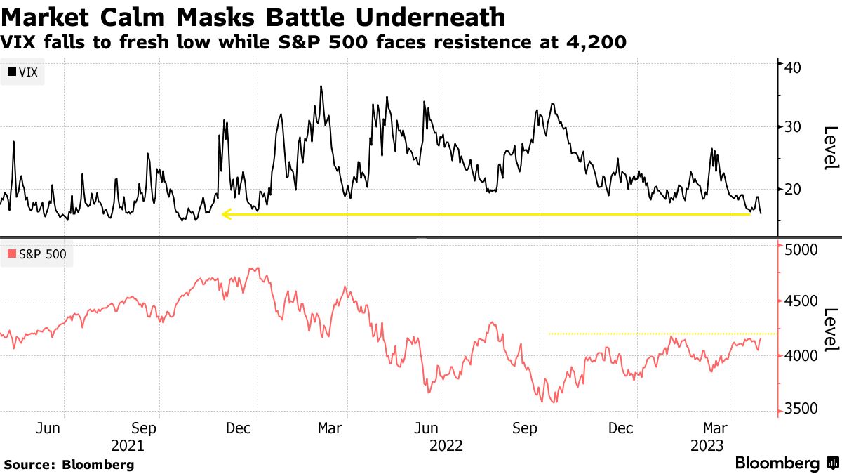 尽管美国银行业的压力和利润衰退引起了许多焦虑,但在四月份并没有在股市表面显现出来。平静占据主导地位,芝加哥期权波动率指数首次自2021年11月以来跌破16。这个衡量期权成本的指标,也被称为VIX,连续六周下滑,而标普500指数则经历了近四年来最为平静的一个月。