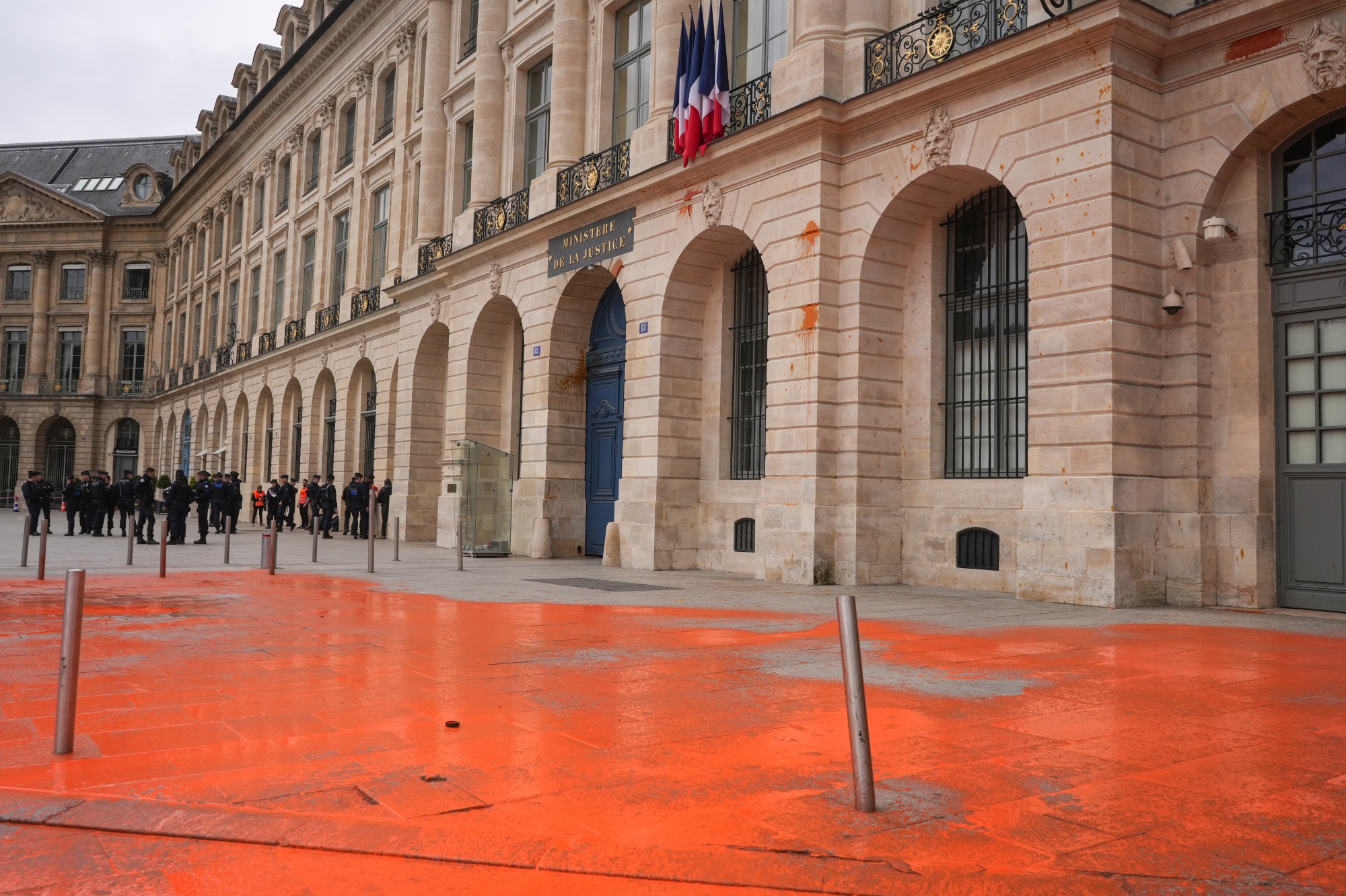 5月1日,位于凡尔登广场的法院大楼外涂满了橙色油漆摄影师:Nathan Laine/Bloomberg这场暴动源于马克龙决心将最低退休年龄从62岁提高到64岁,即使抗议也无法推翻已经成为法律的事实,即使这导致他在议会失去了多数席位。