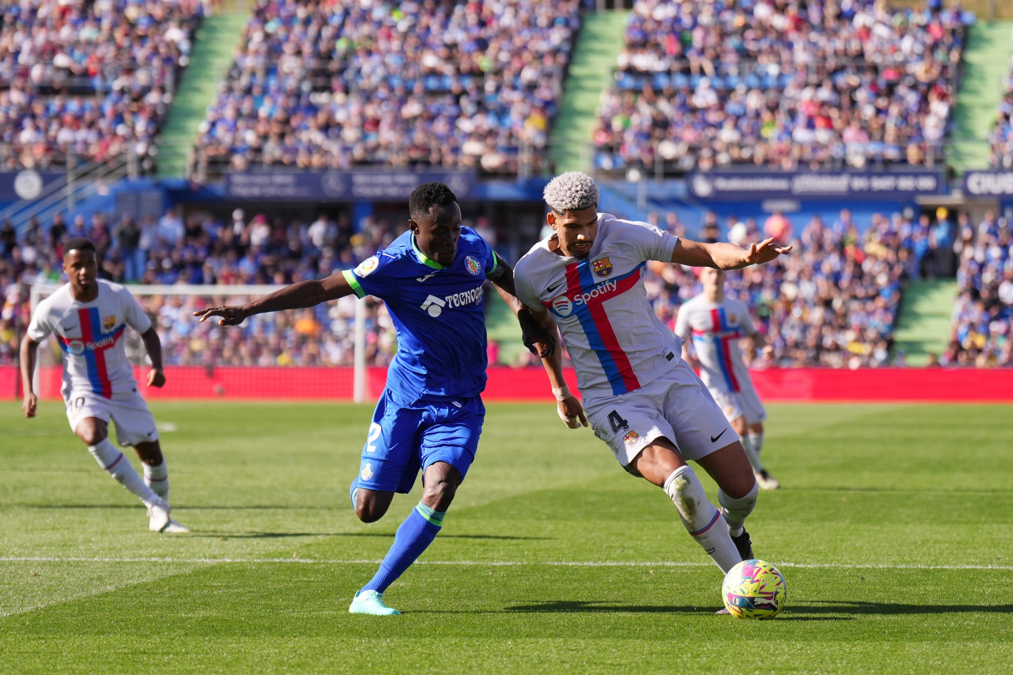 赫塔菲CF的杰内·达科纳姆(Djené Dakonam)和巴塞罗那足球俱乐部的罗纳德·阿劳霍(Ronald Araujo)在西班牙赫塔菲进行的赛事中。