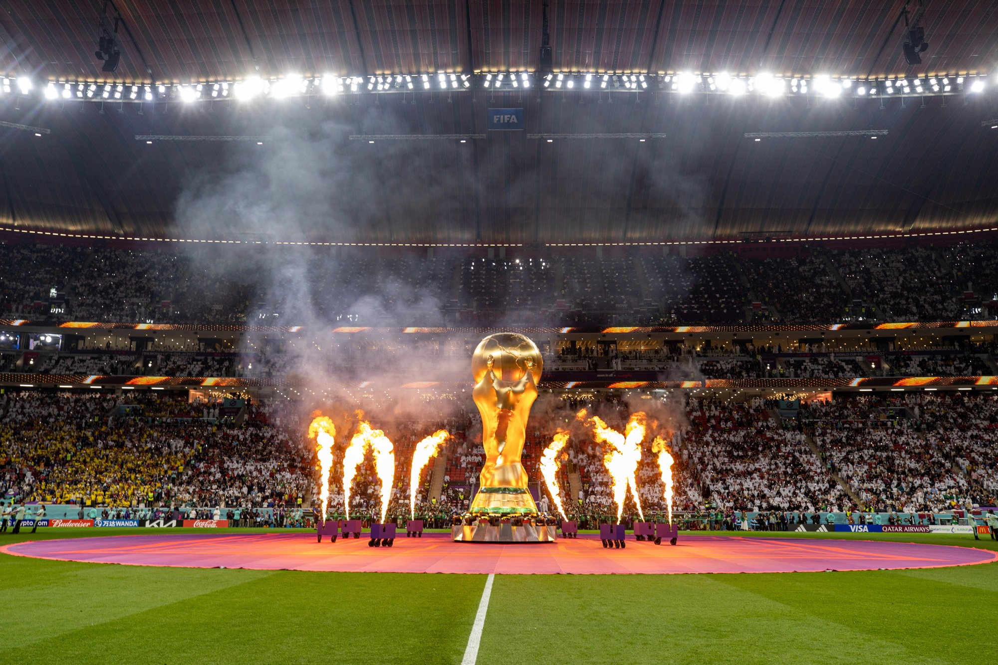 2022年11月20日,在卡塔尔和厄瓜多尔之间的FIFA世界杯开幕比赛前,巨型FIFA世界杯奖杯周围的烟火。摄影师:Christopher Pike/BloombergFIFA在回答问题的电子邮件中表示,他们意识到大型赛事对环境的影响,以及需要应对气候变化。FIFA表示,世界杯首次实现了“完全碳中和”。为减少比赛的碳足迹所采取的措施包括建设节能体育场馆、使用低排放交通工具和可持续管理实践。FIFA表示,所有剩余排放都通过认证的碳信用额度进行抵消。