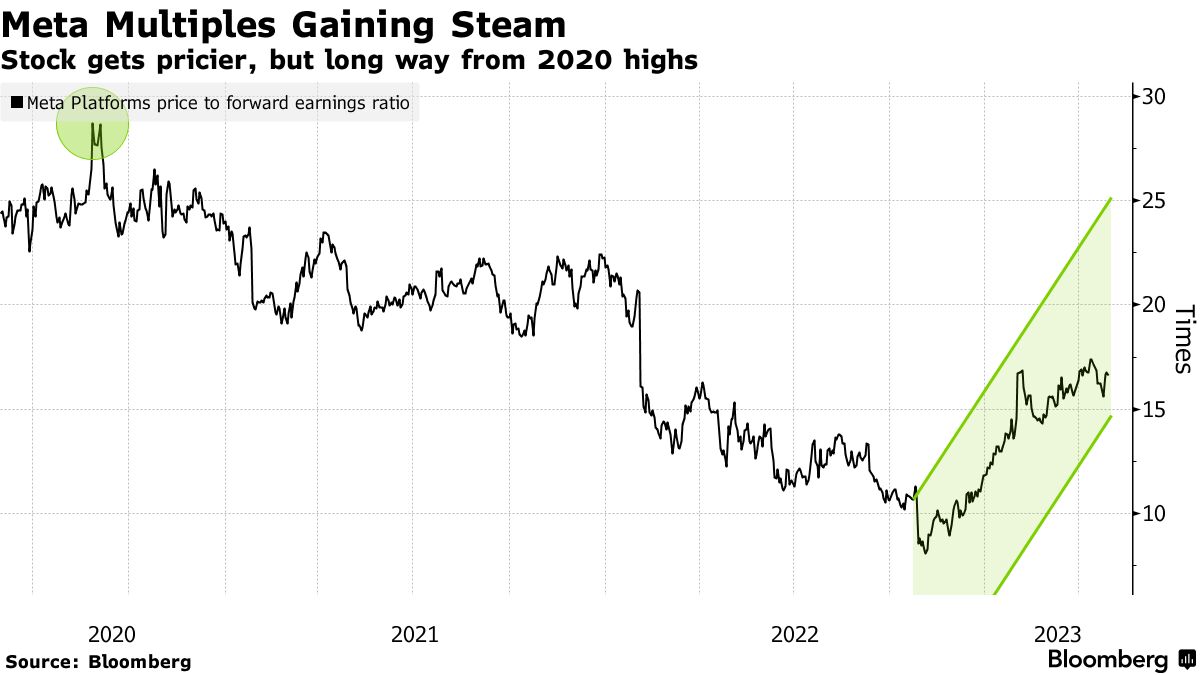 Meta Platforms Inc. 自去年 11 月以来从七年低点暴涨了 172%,迅速使其股价变得更昂贵。根据彭博编制的数据,这家 Facebook 母公司的股票,去年年底以创纪录的 8.1 倍前瞻收益倍数交易,现在以 18 倍交易。这家社交媒体巨头与 Alphabet Inc. 一样,仍然是最便宜的大型科技股之一。