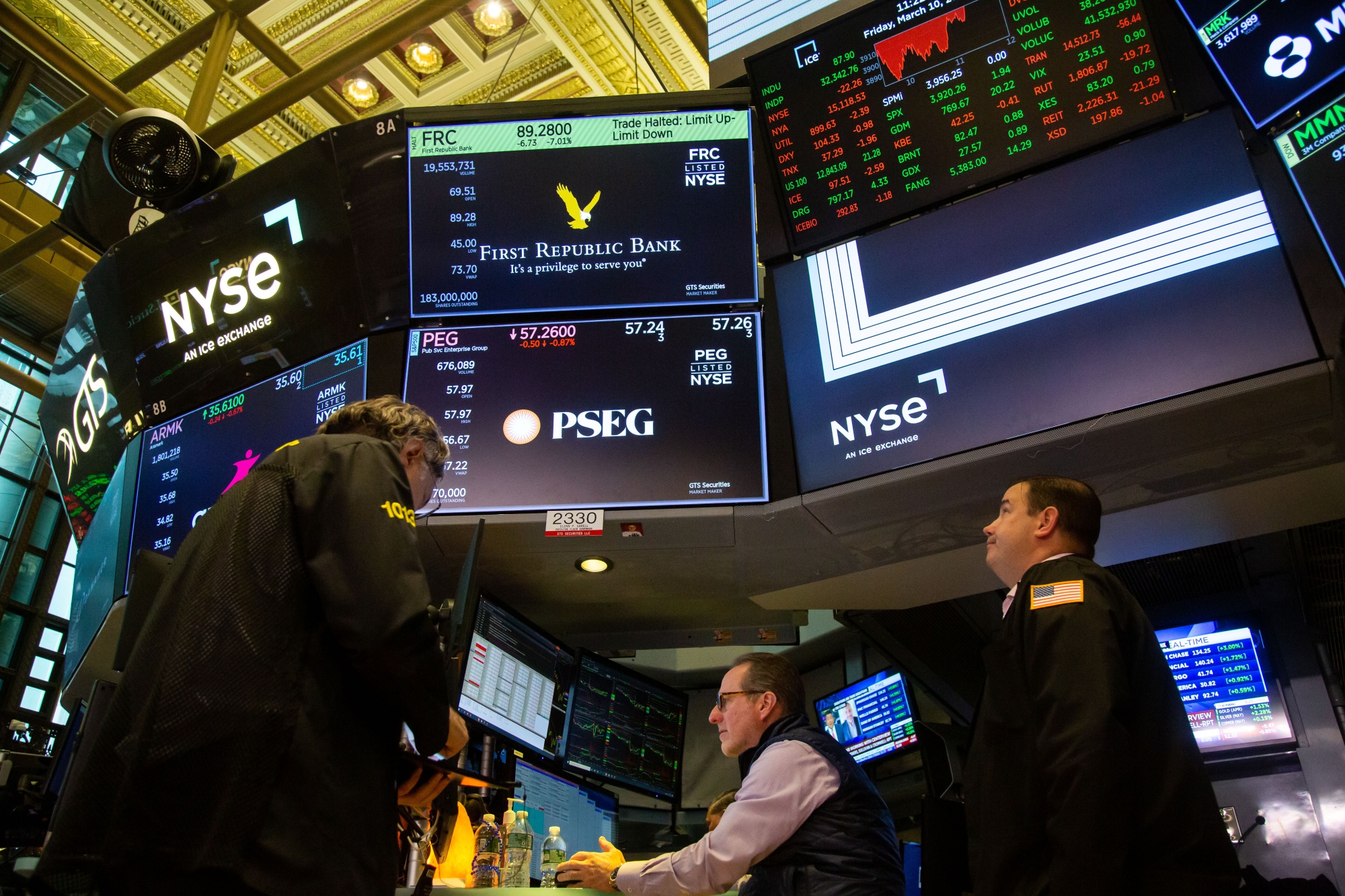 第一共和国银行标识,交易在纽约证券交易所的地板上停止,日期为3月10日。摄影师:Michael Nagle/Bloomberg然后,盈利日到来,一切都改变了。在几家同行地区银行给投资者带来超出预期的演示之后,第一共和国在4月24日的盘后更新证实了他们最坏的担忧。存款在几周内暴跌了700亿美元,几乎是该银行总额的一半,因为客户在危机发生时纷纷提取资金。其股价,今年已经下跌了87%,再次陷入自由落体。