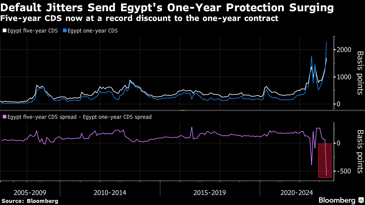**违约保护:**埃及的债券市场前所未有地紧张。未来12个月内违约风险的保险成本已经激增至创纪录水平,导致一个异常情况,使得保费超过五年合同的幅度达到历史最高。