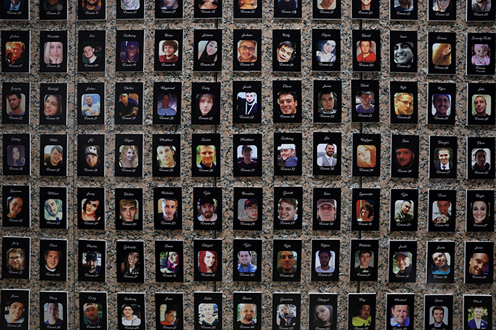 在位于弗吉尼亚州阿灵顿的美国缉毒局总部的芬太尼受害者照片在芬太尼纪念馆展出。